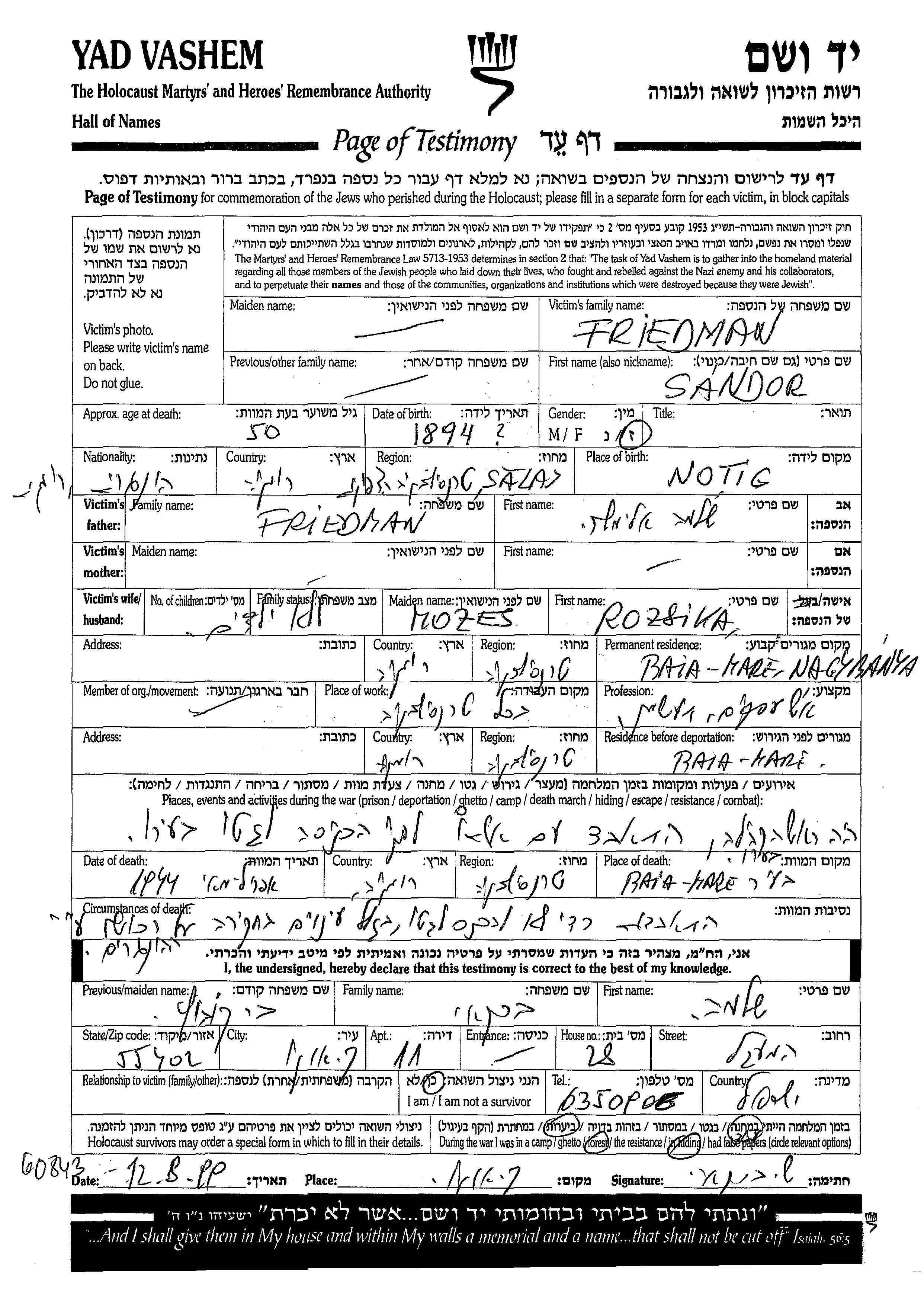 Sandor Friedman est né à Notig, Roumanie en 1894. Il était Industriel. Avant la seconde guerre mondiale il vivait à Baia Mare, Roumanie.