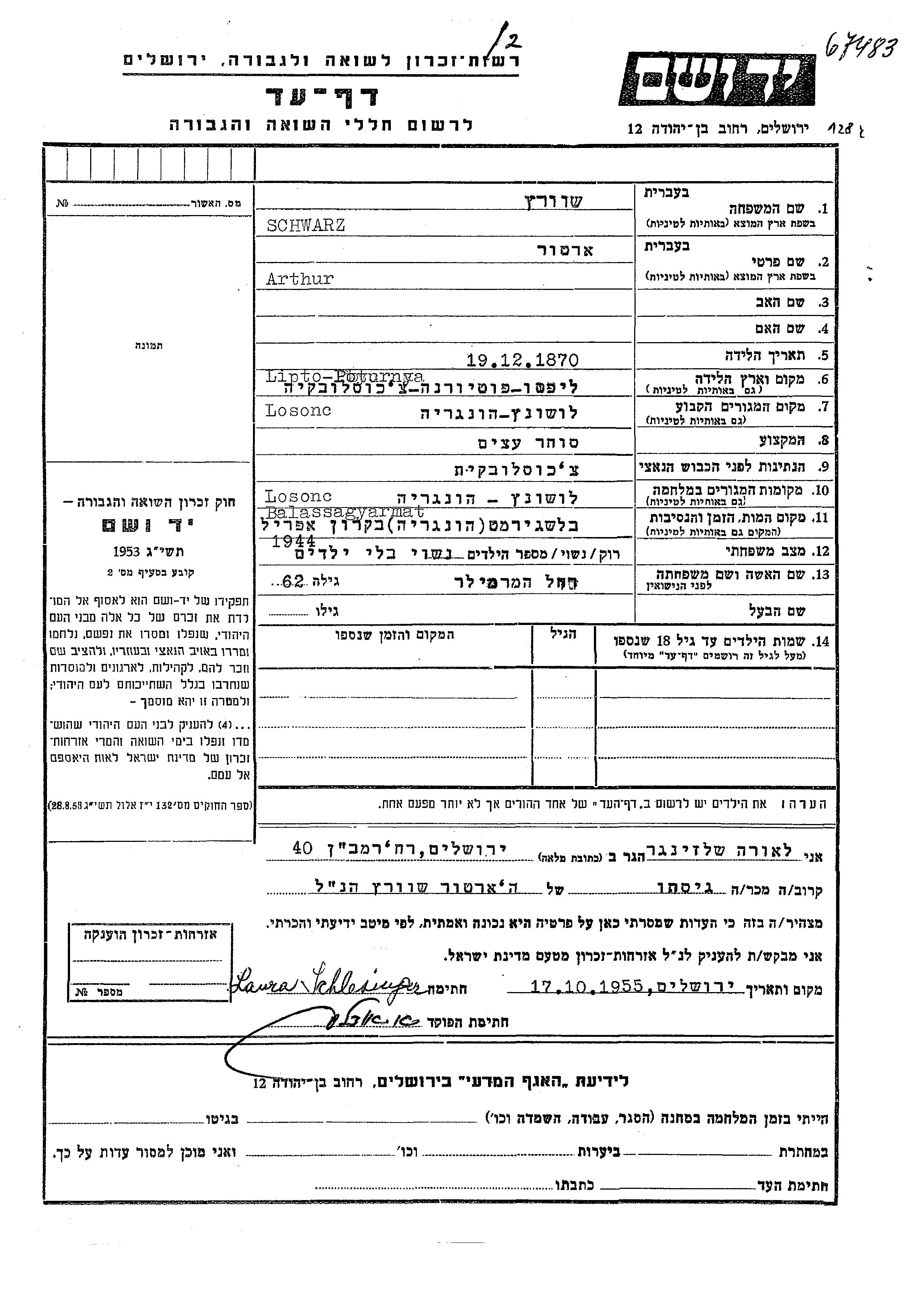 Schwarz Arthur 1870 Losonc, Tchécoslovaquie Feuille de témoignage