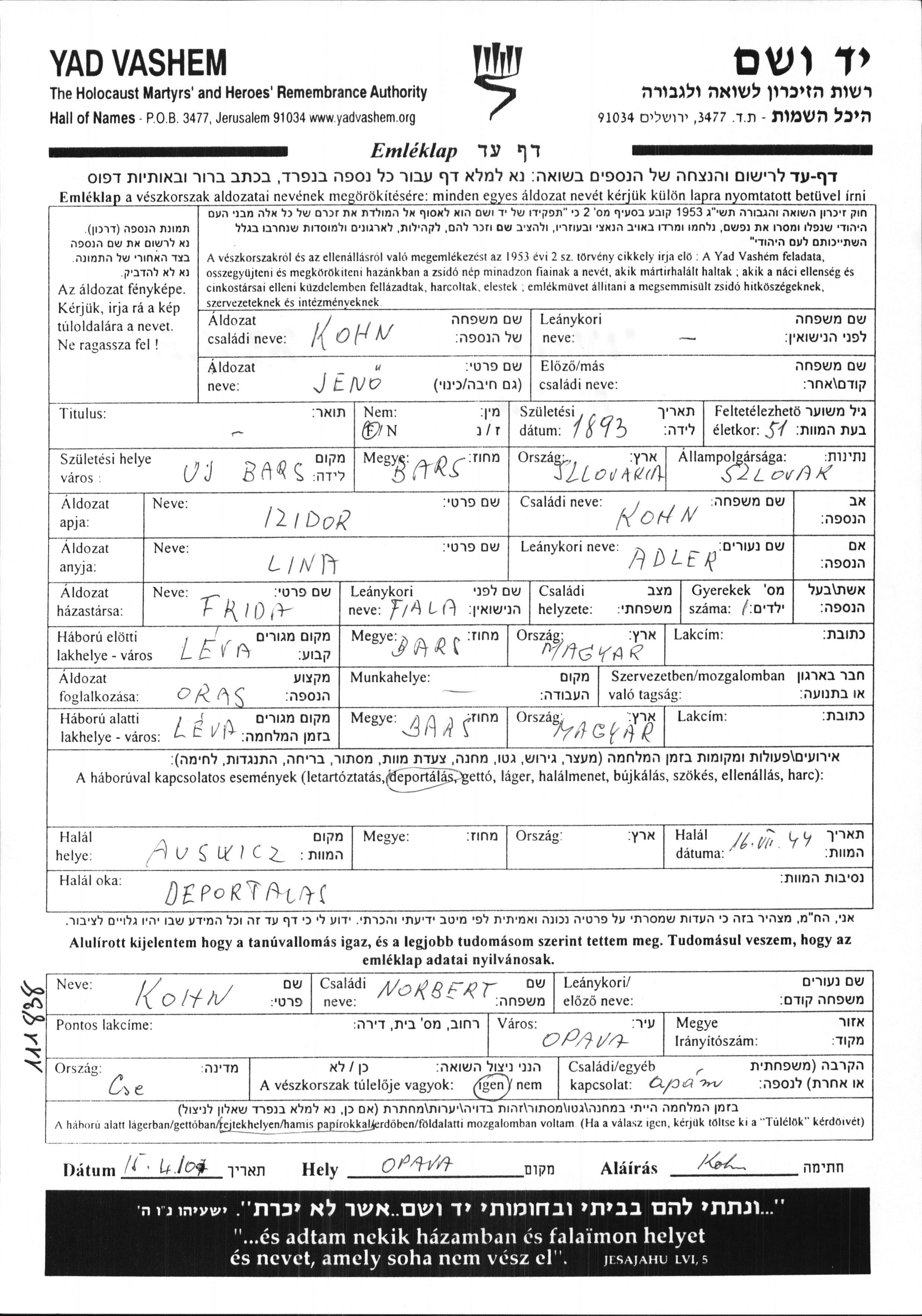 Kohn Jeno 1893 Leva, Tchécoslovaquie Feuille de témoignage