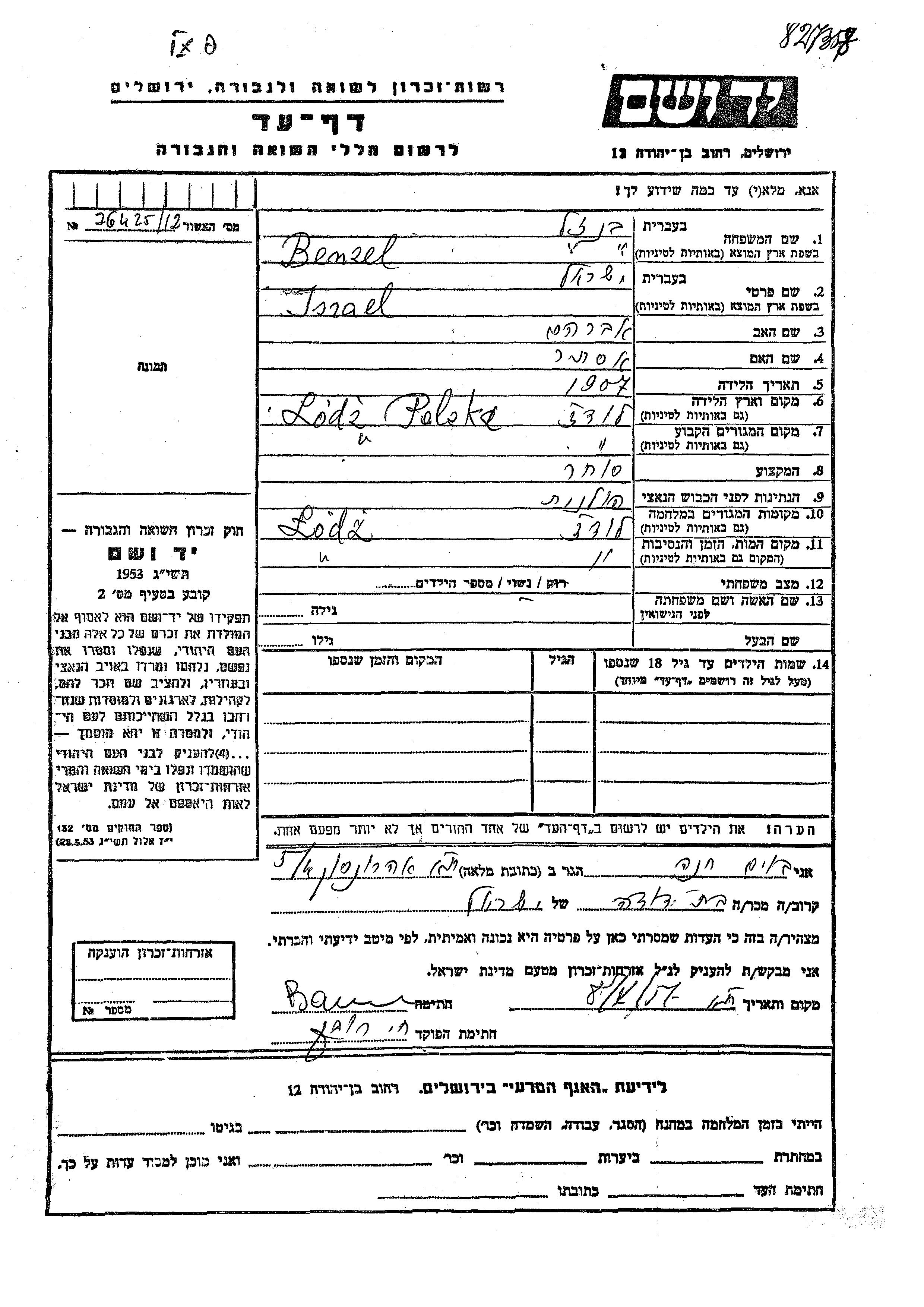 Benzel Israel 1907 Lodz, Pologne Feuille de témoignage