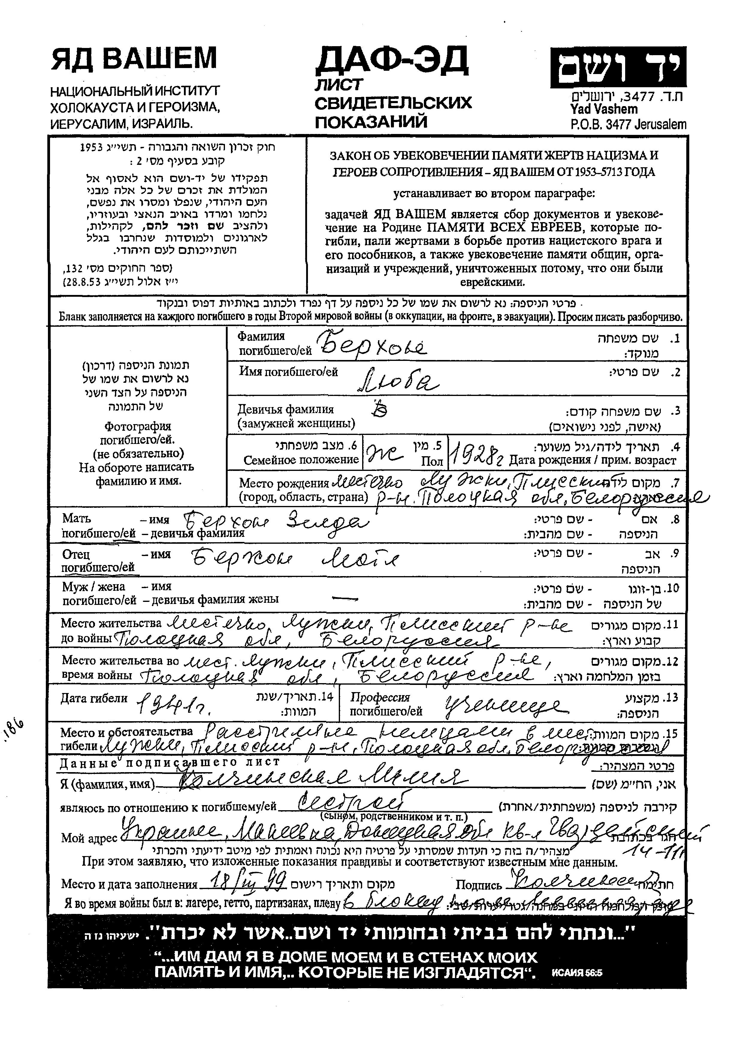 Berchon Liuba 1927 endroit inconnu, Feuille de témoignage