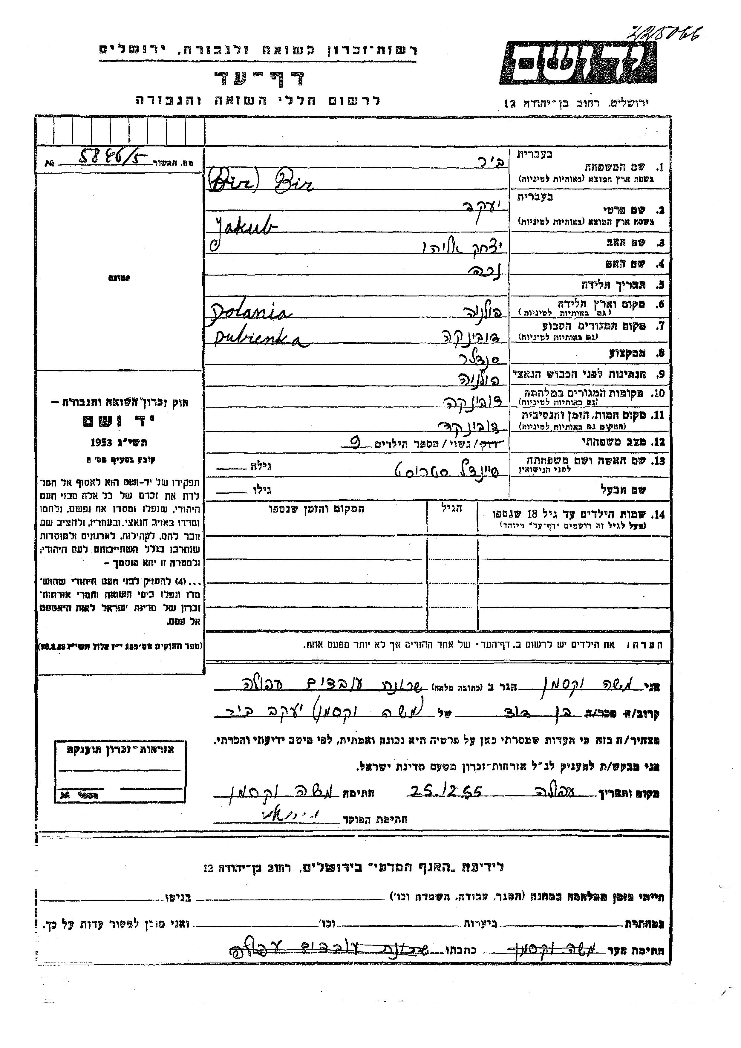Bir Jakub Dubienka, Pologne Feuille de témoignage