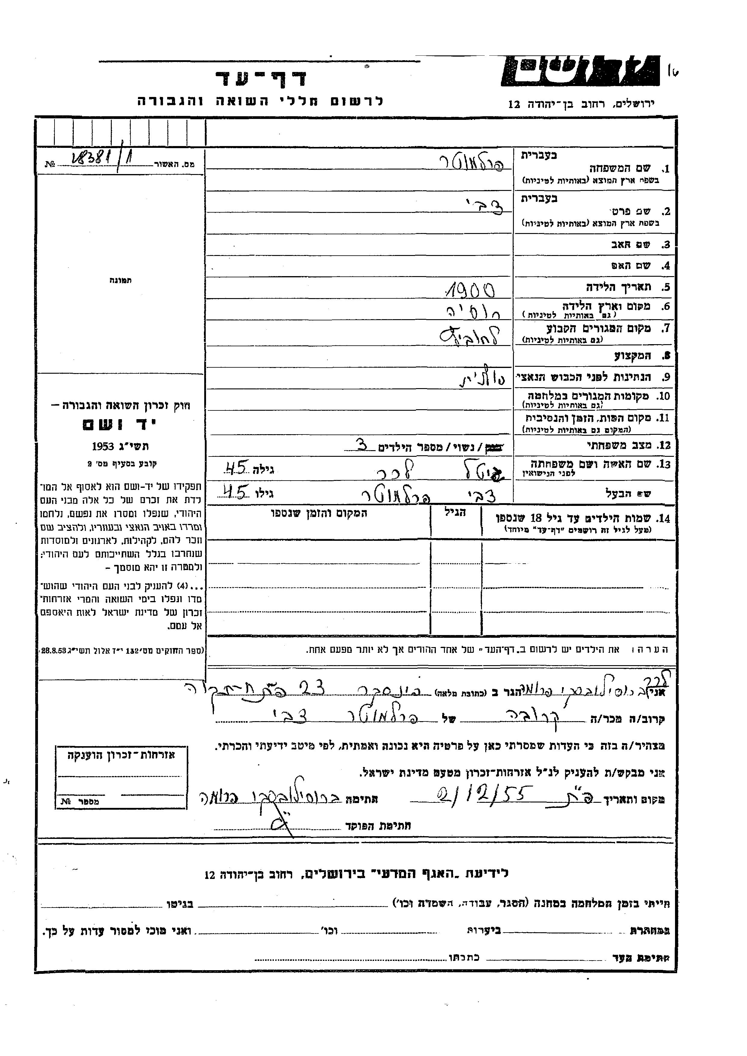 Perlmuter Tzvi 1900 Lachowicze, Pologne Feuille de témoignage