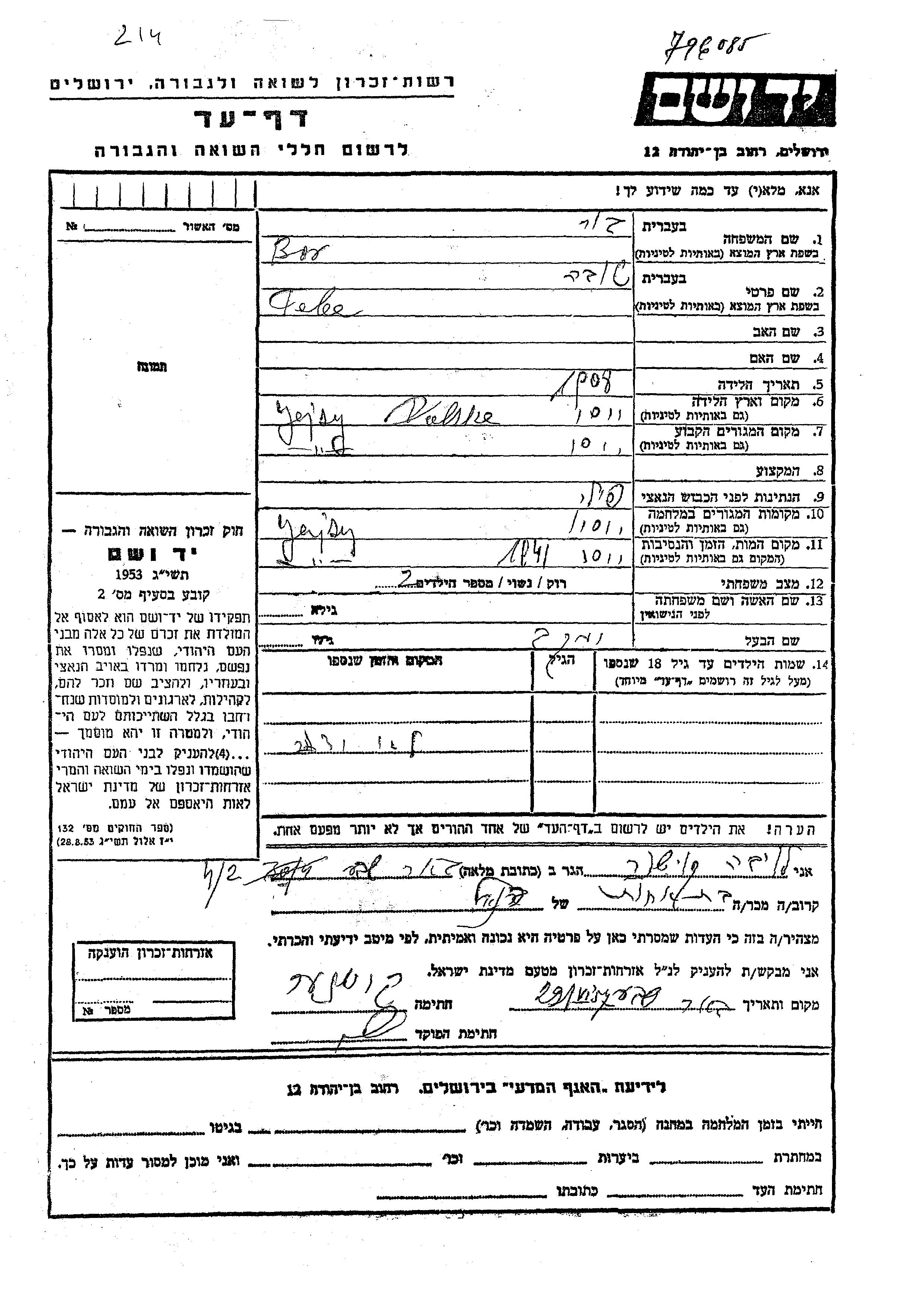 Yad Vashem - Pages of Testimony Names Memorial Collection