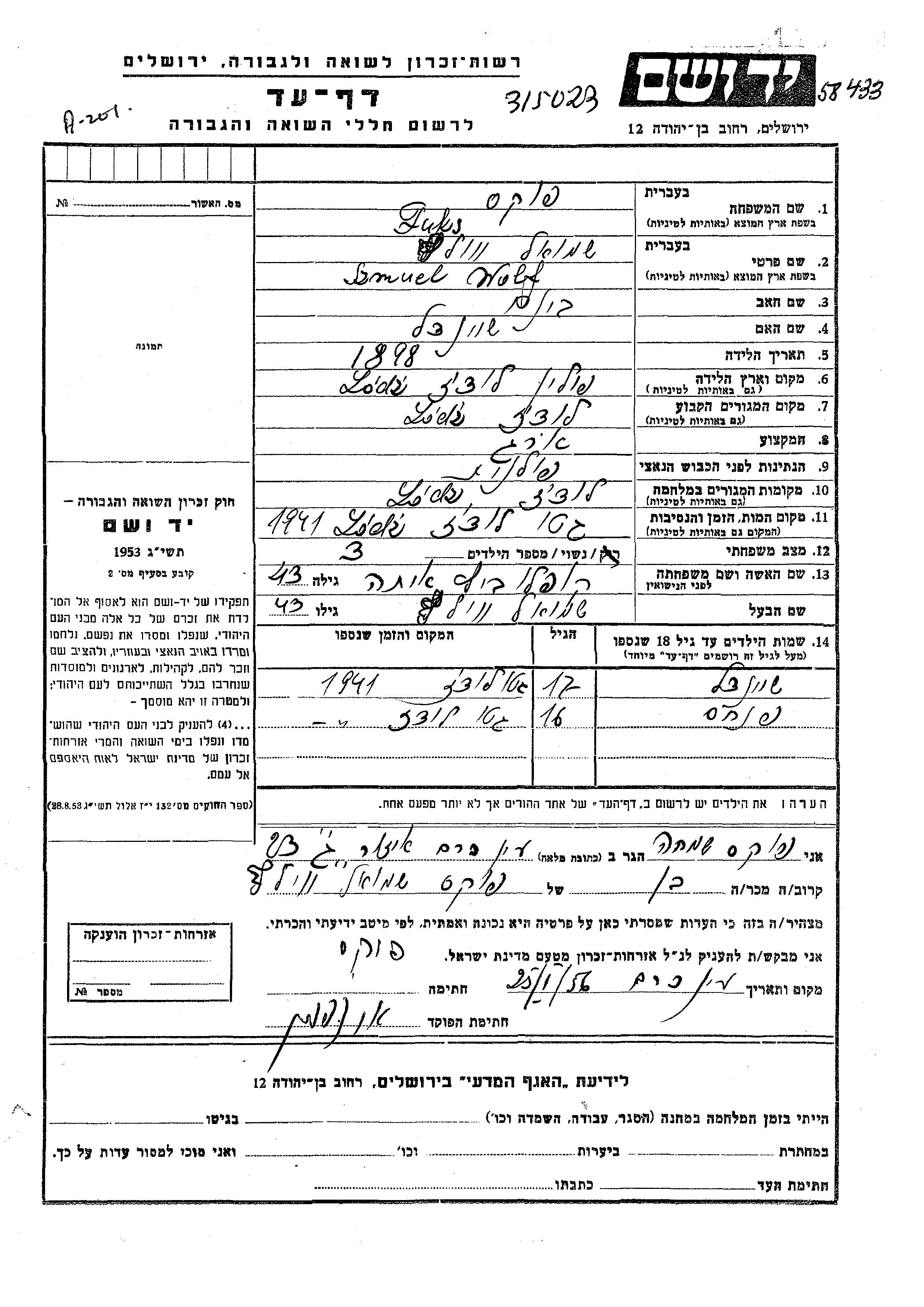 Fuks Szmuel Wolf 1898 Lodz, Pologne Feuille de témoignage