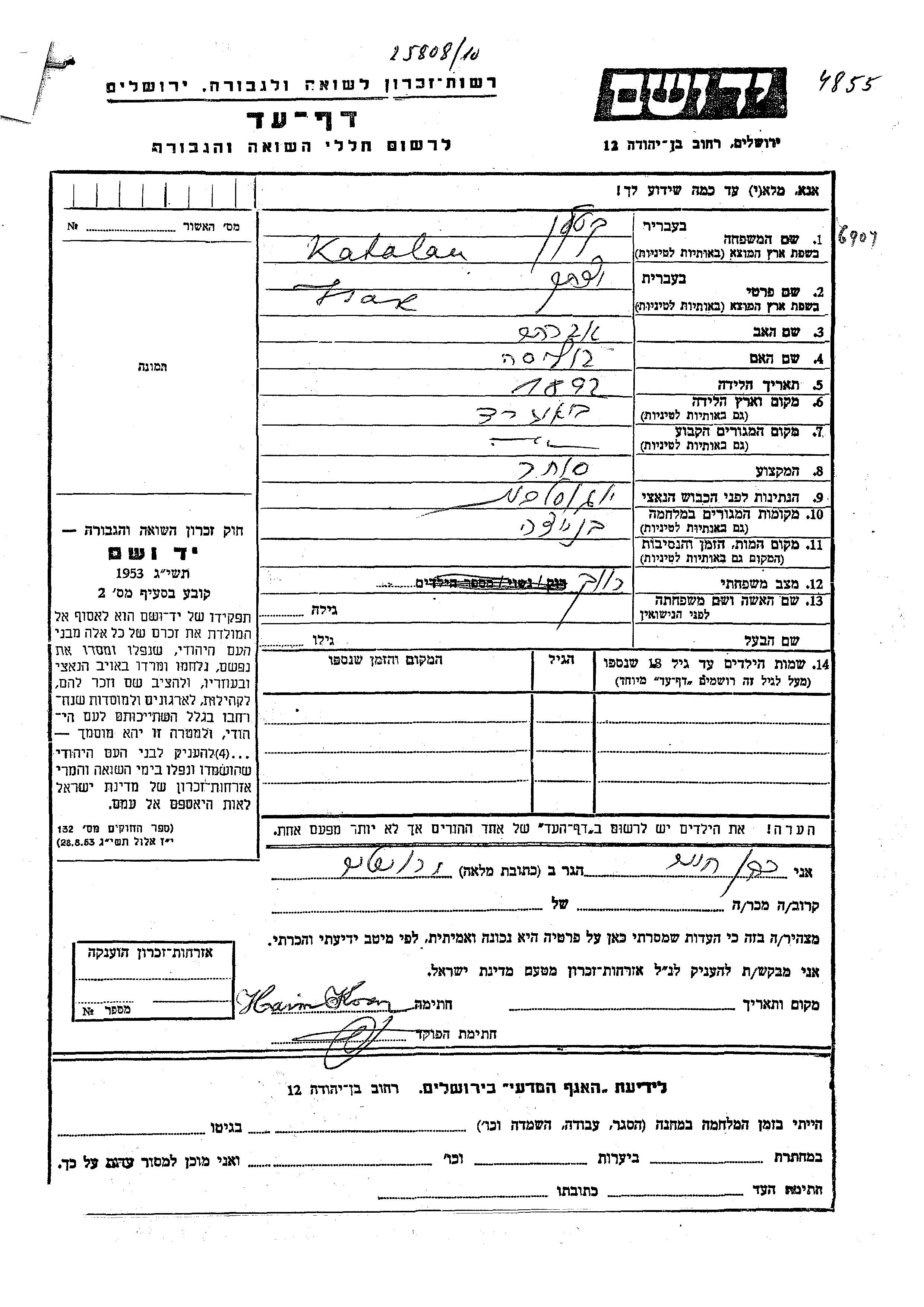 Katalan Isak 1892 endroit inconnu, Feuille de témoignage