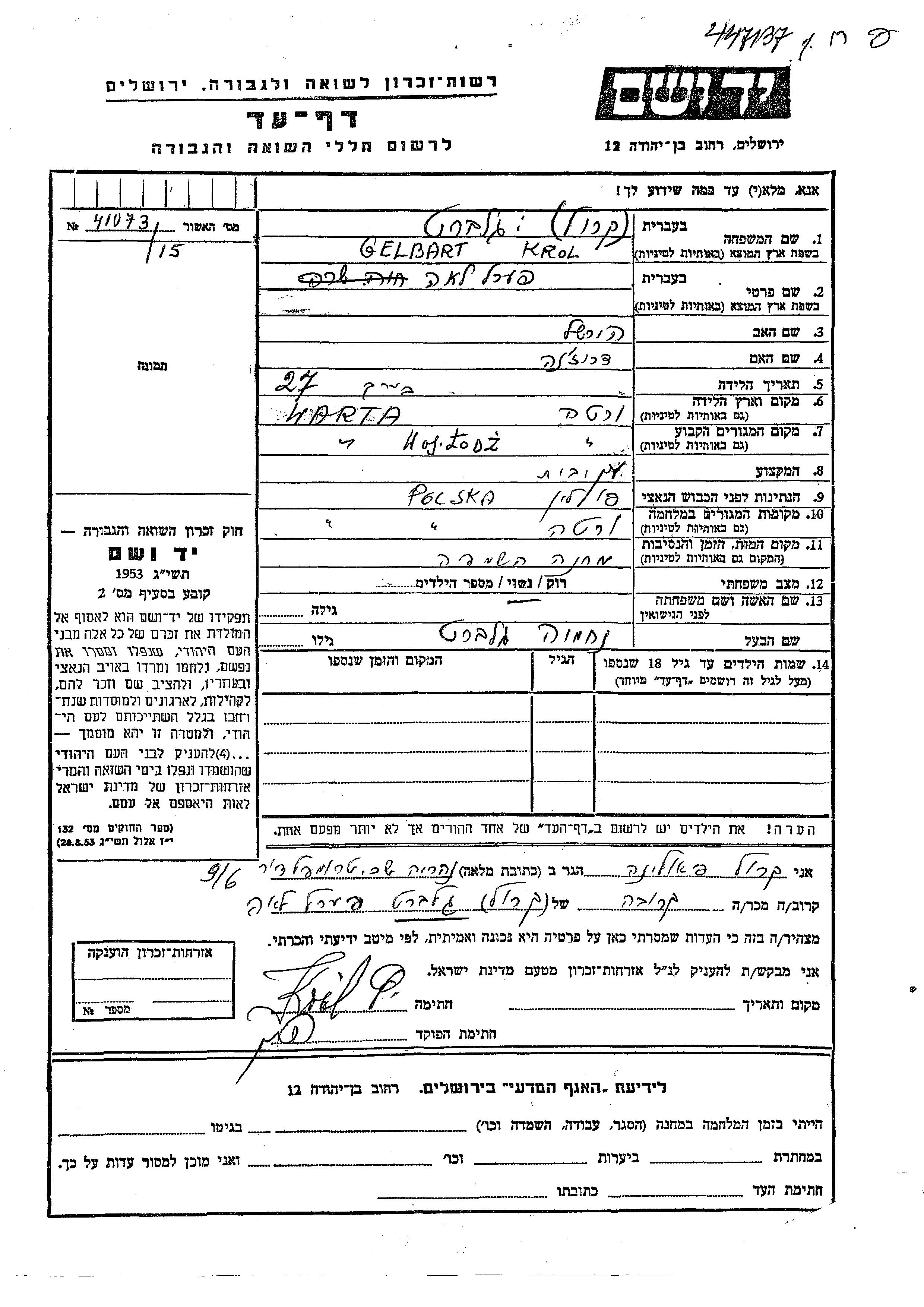 Gelbart Krol Perl Lea Warta, Pologne Feuille de témoignage