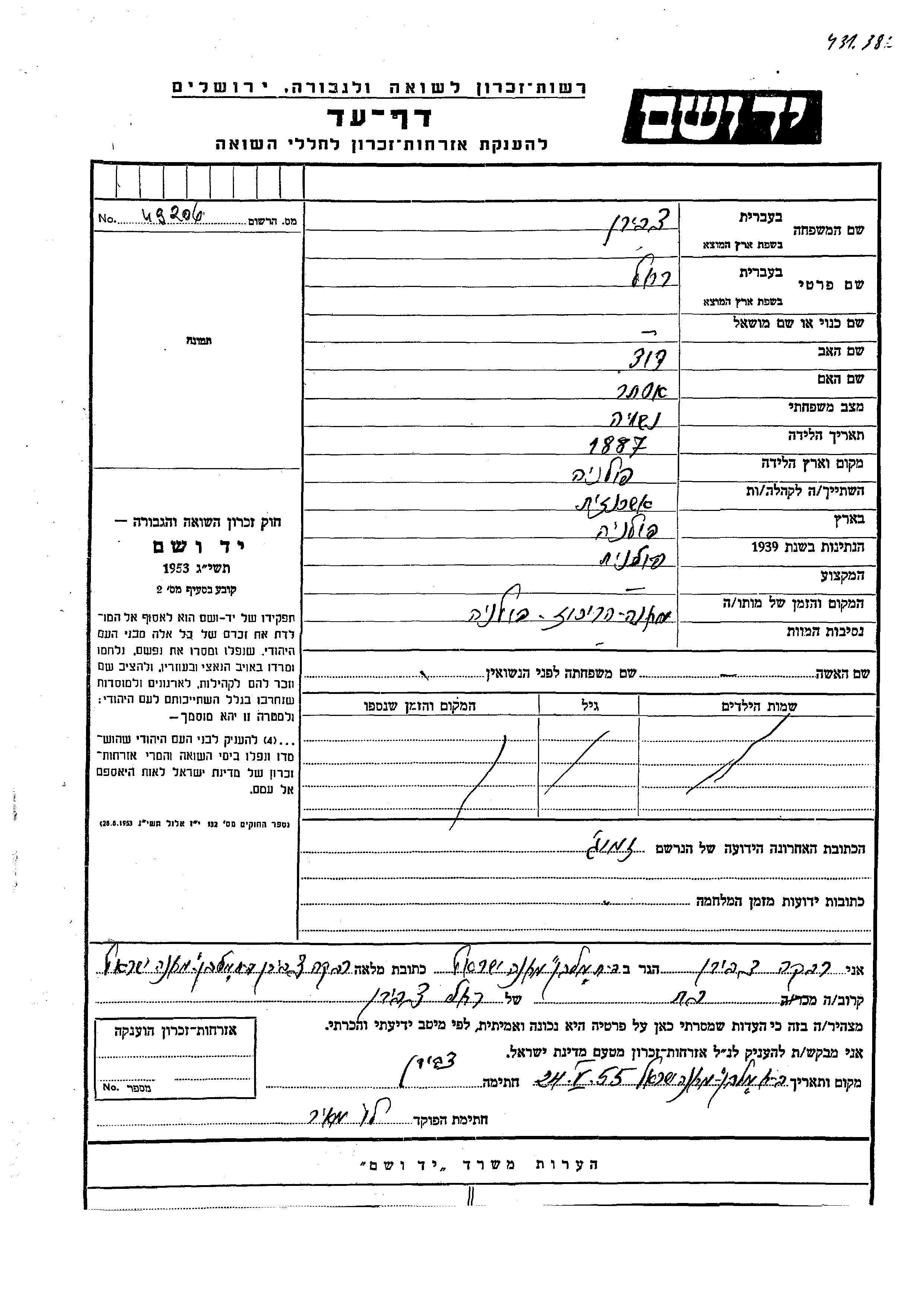 Yad Vashem - Pages of Testimony Names Memorial Collection