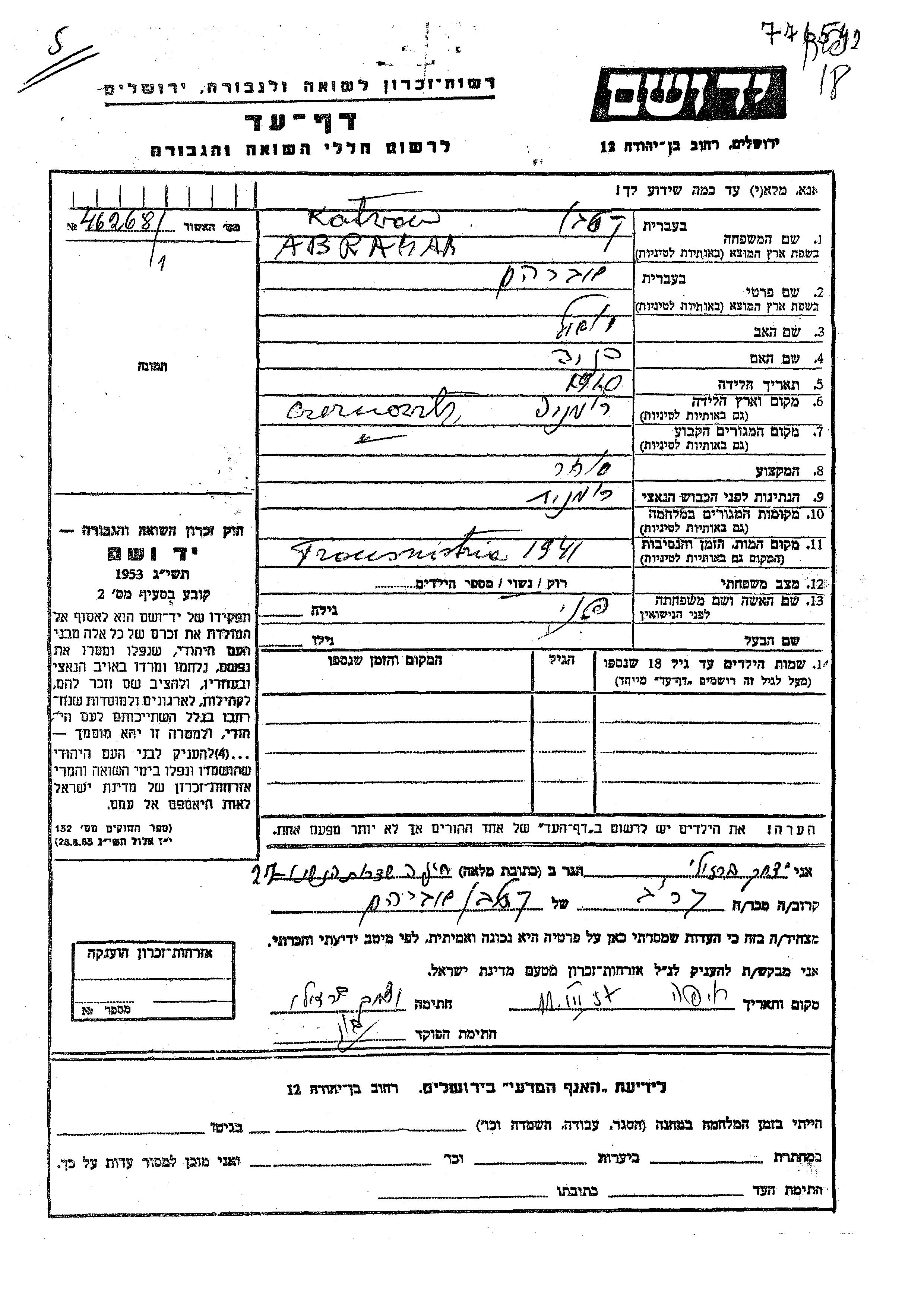 Katwan Abraham 1910 endroit inconnu, Feuille de témoignage