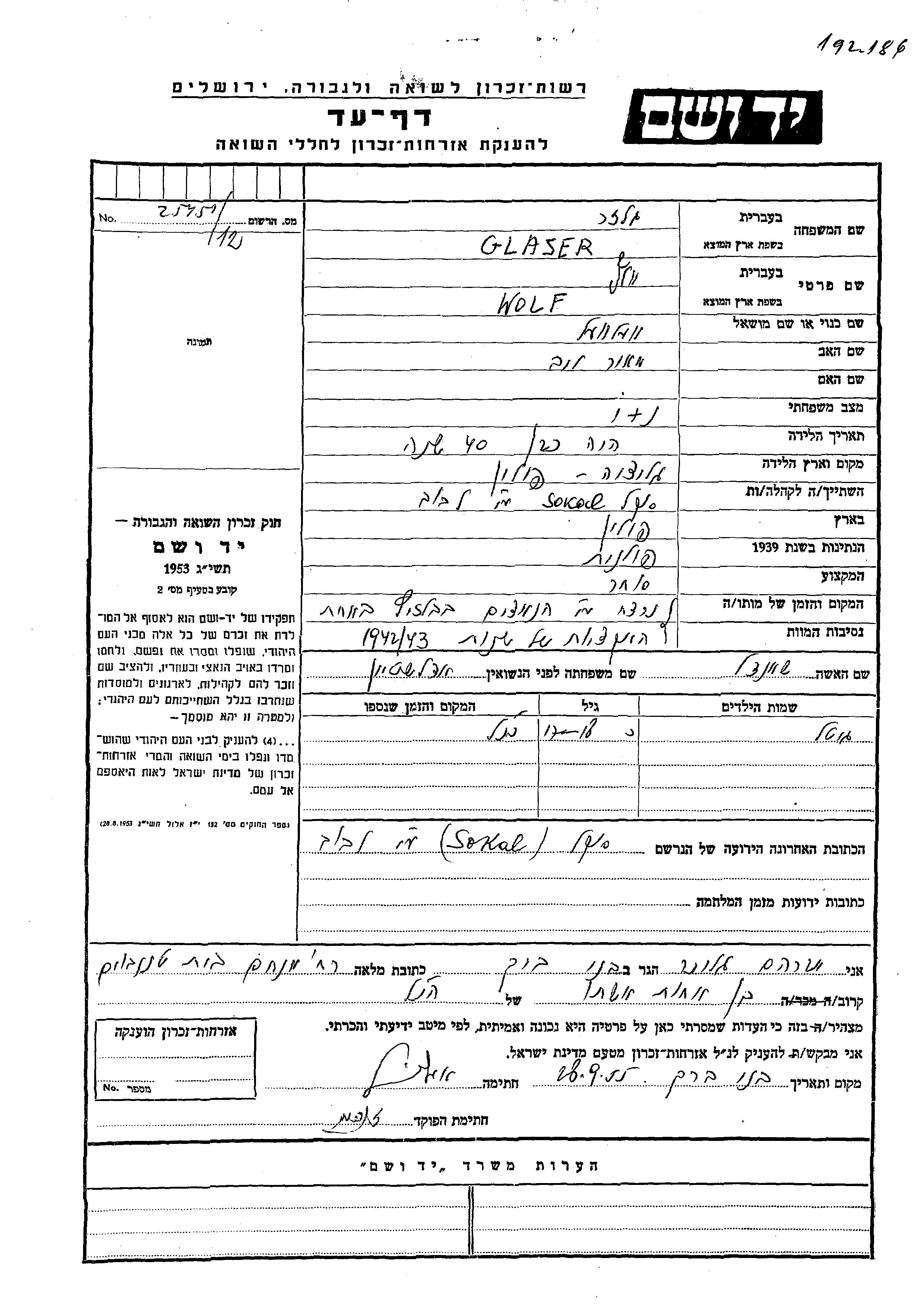Glaser Wolf Sokal, Pologne Feuille de témoignage