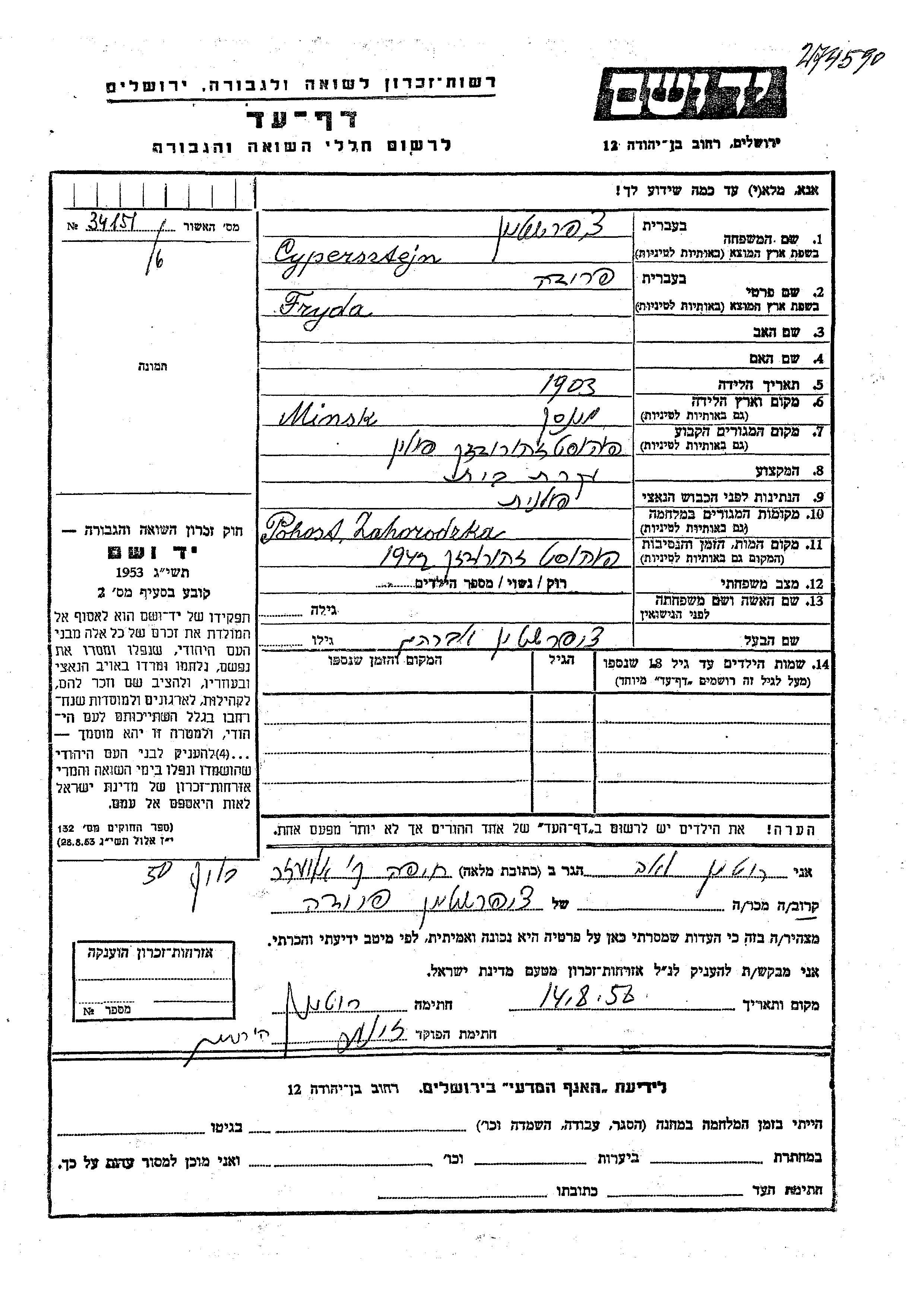 Cypersztejn Fryda 1903 Pohost Zahorodzki, Pologne Feuille de témoignage