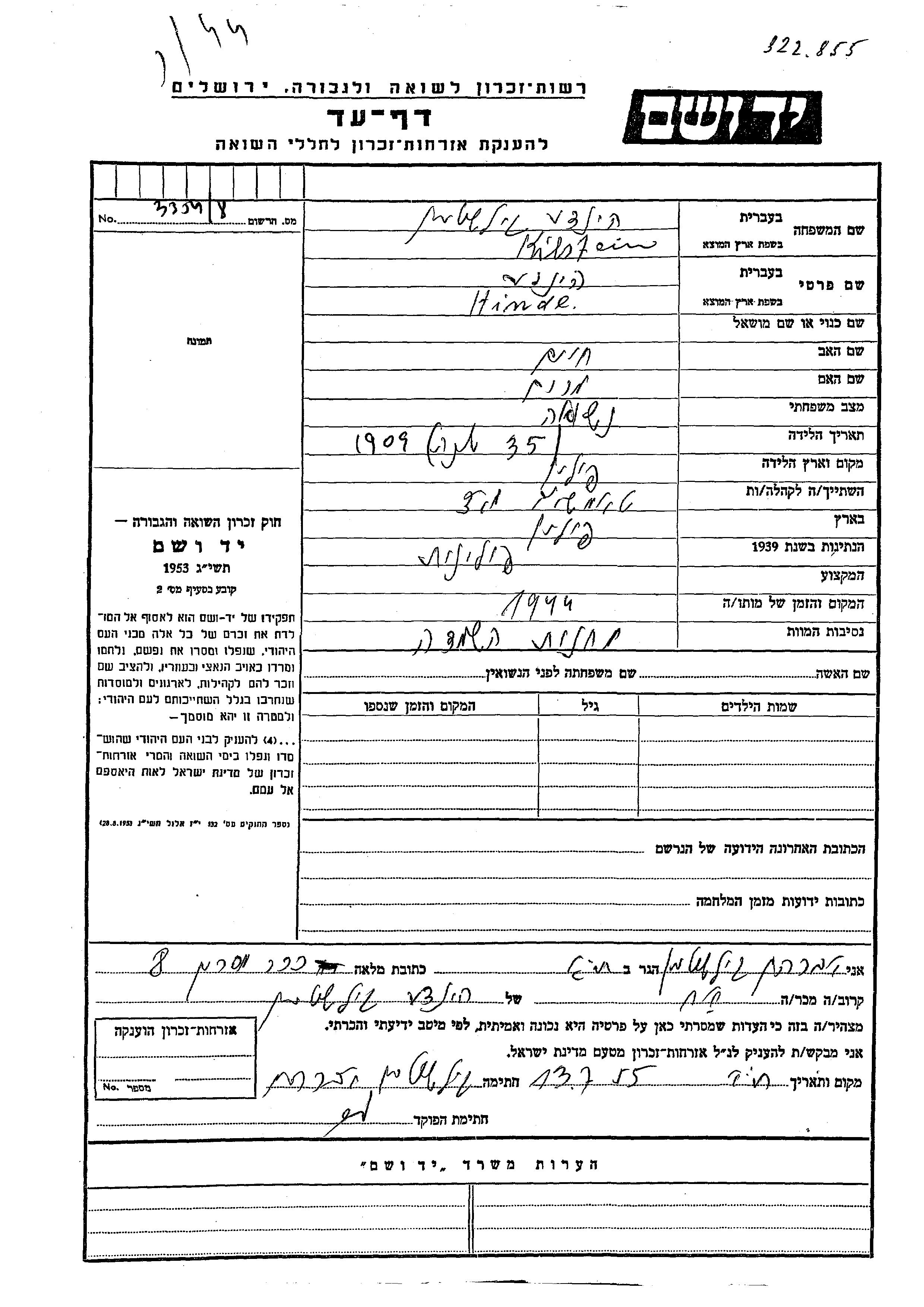 Yad Vashem - Pages of Testimony Names Memorial Collection