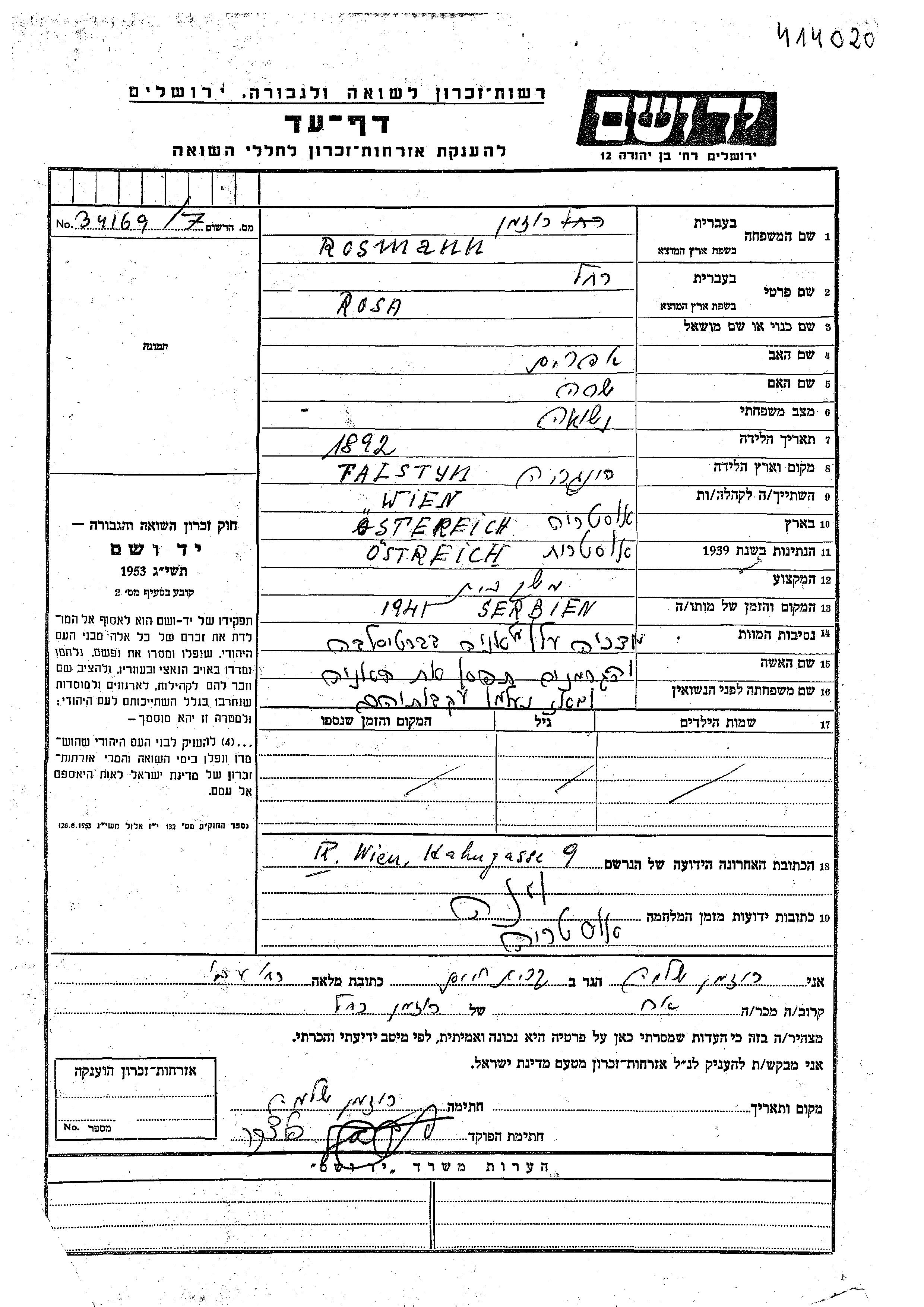 Rosmann Rozman Rosa Rakhel 1892 Wien, Autriche Feuille de témoignage