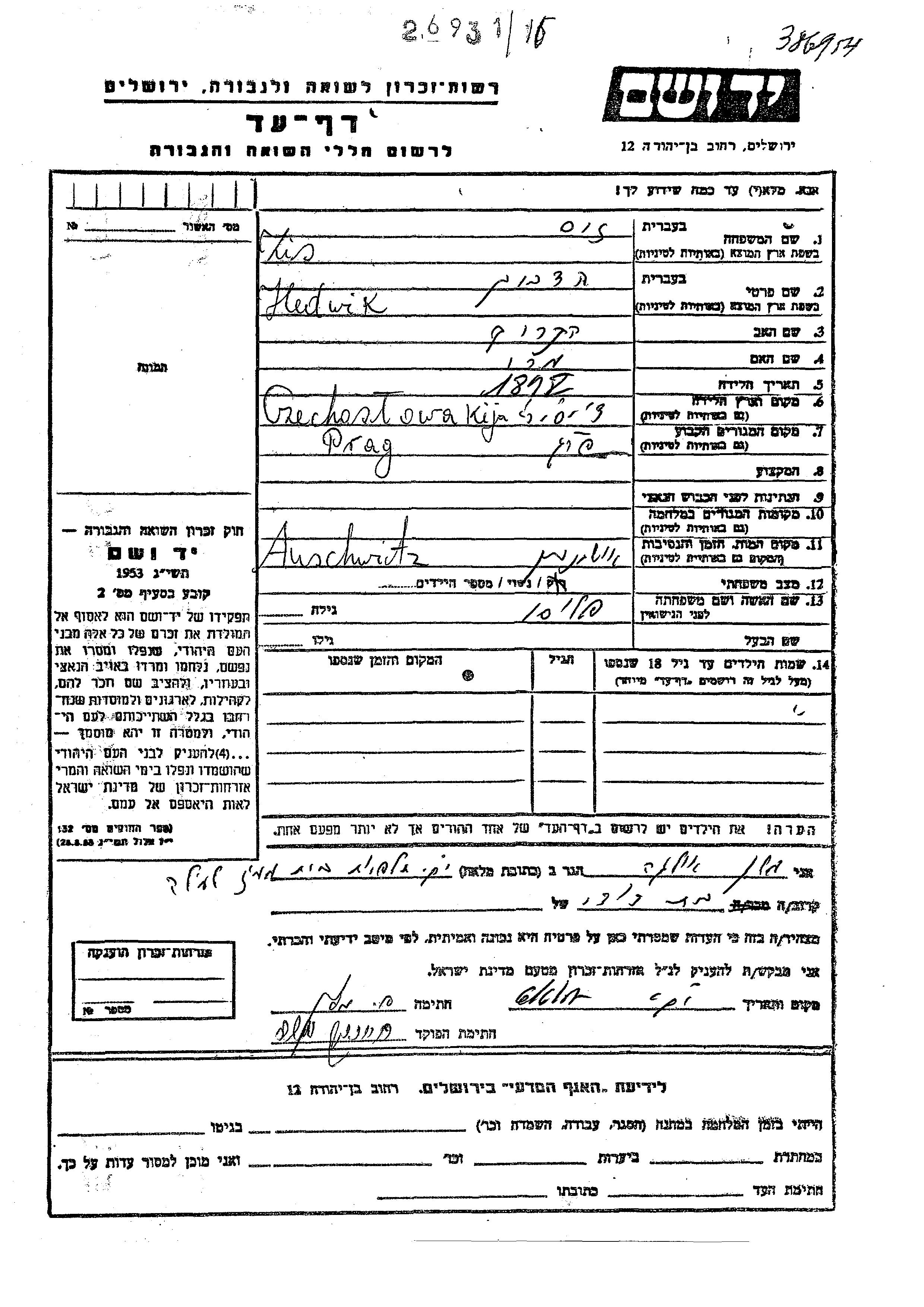 Yad Vashem - Pages of Testimony Names Memorial Collection