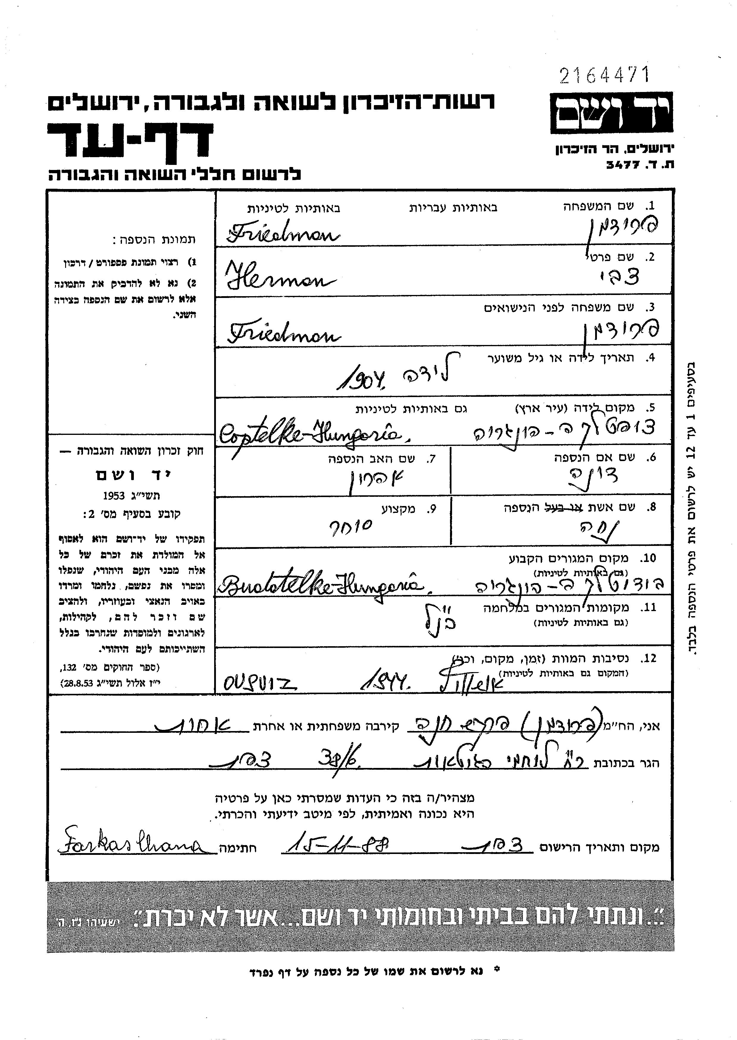 Friedman Herman Tzvi 1904 Budotelke, Roumanie Feuille de témoignage