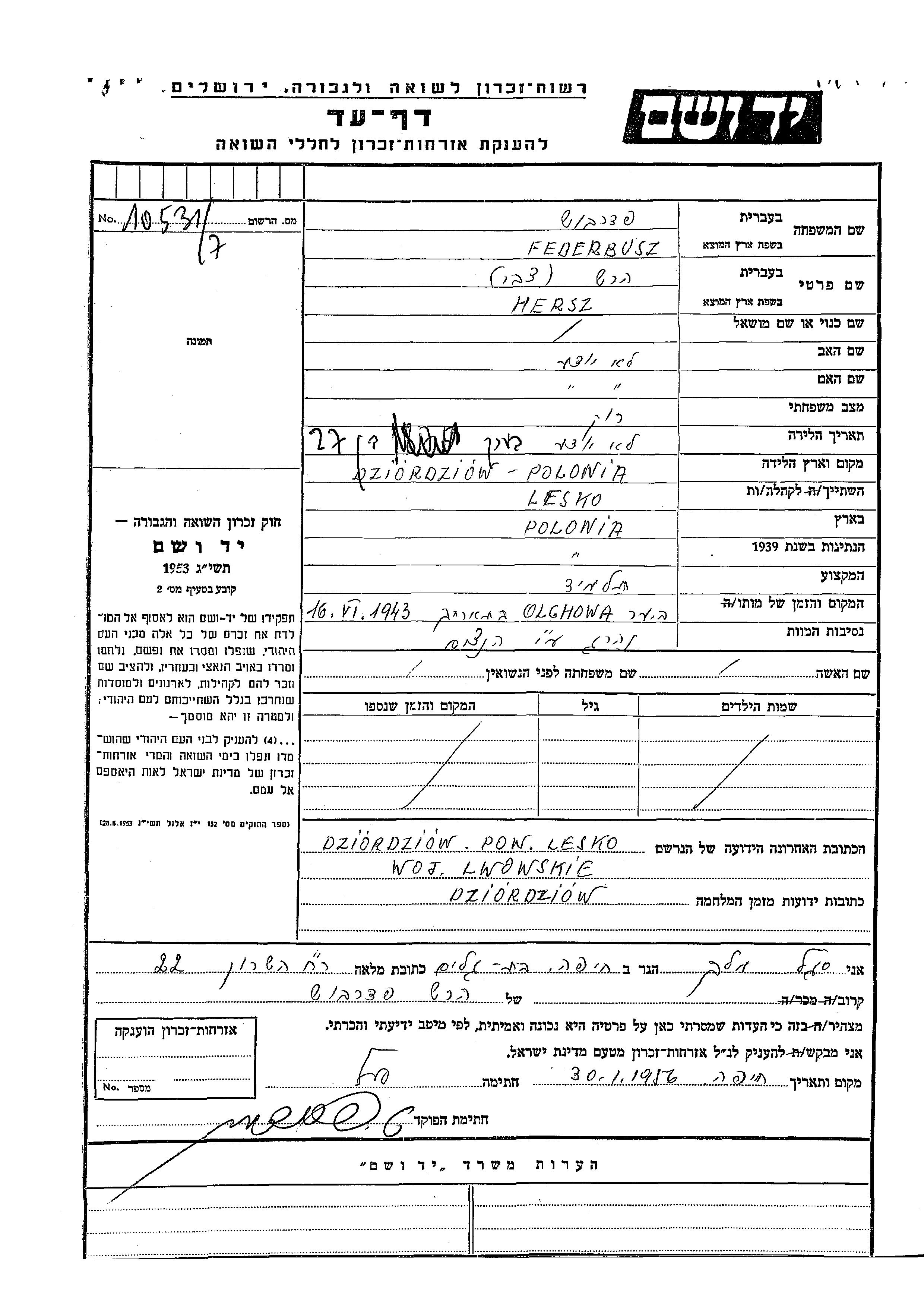 Hersh Tzvi Federbusz est né à Dziordziow, Pologne. Il était Élève et Célibataire. Avant la seconde guerre mondiale il vivait à Lesko, Pologne. Au cours de la guerre, il était à Dziordziow, Pologne.