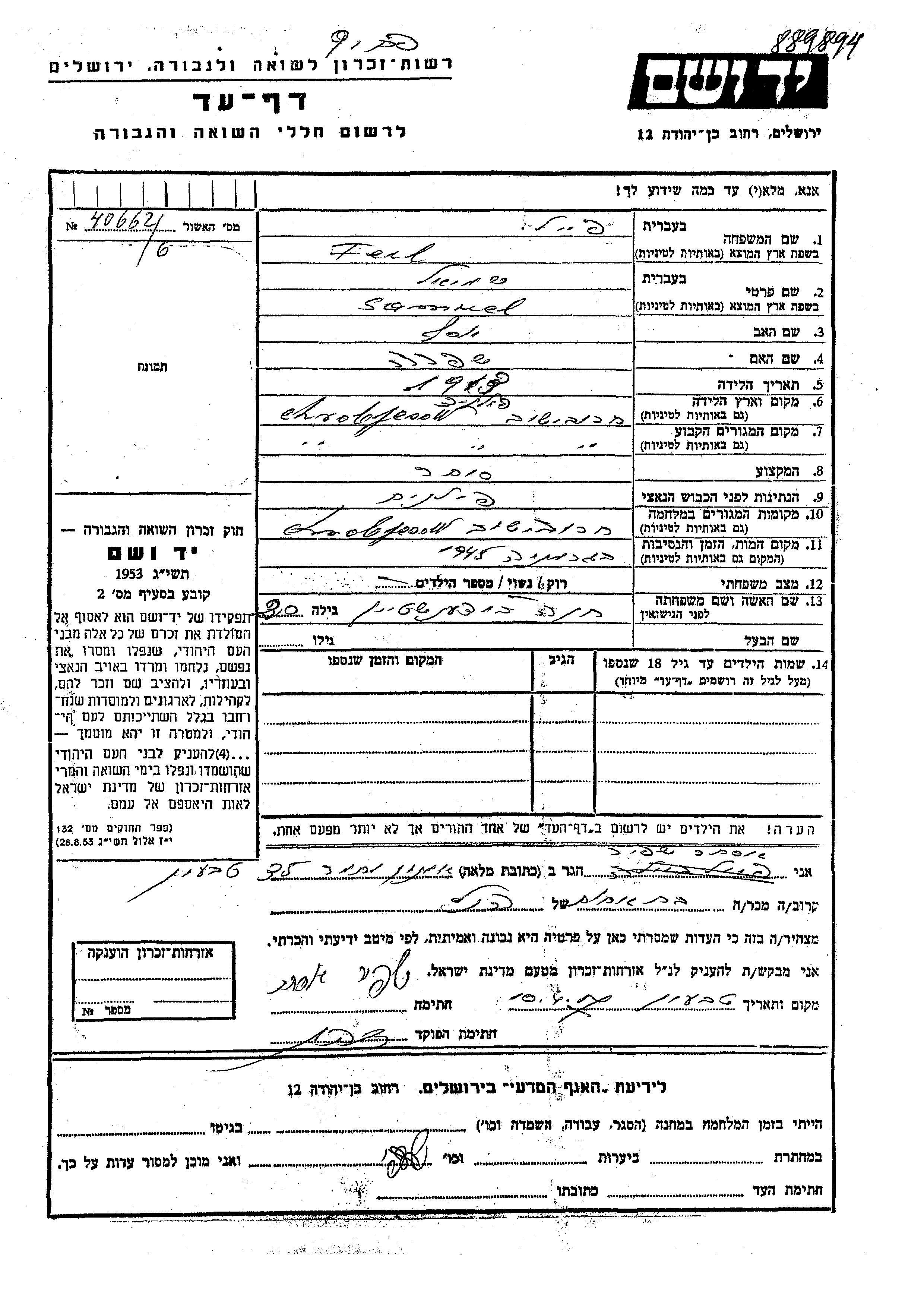 Feil Shmuel 1913 Chrobjeszow, Pologne Feuille de témoignage