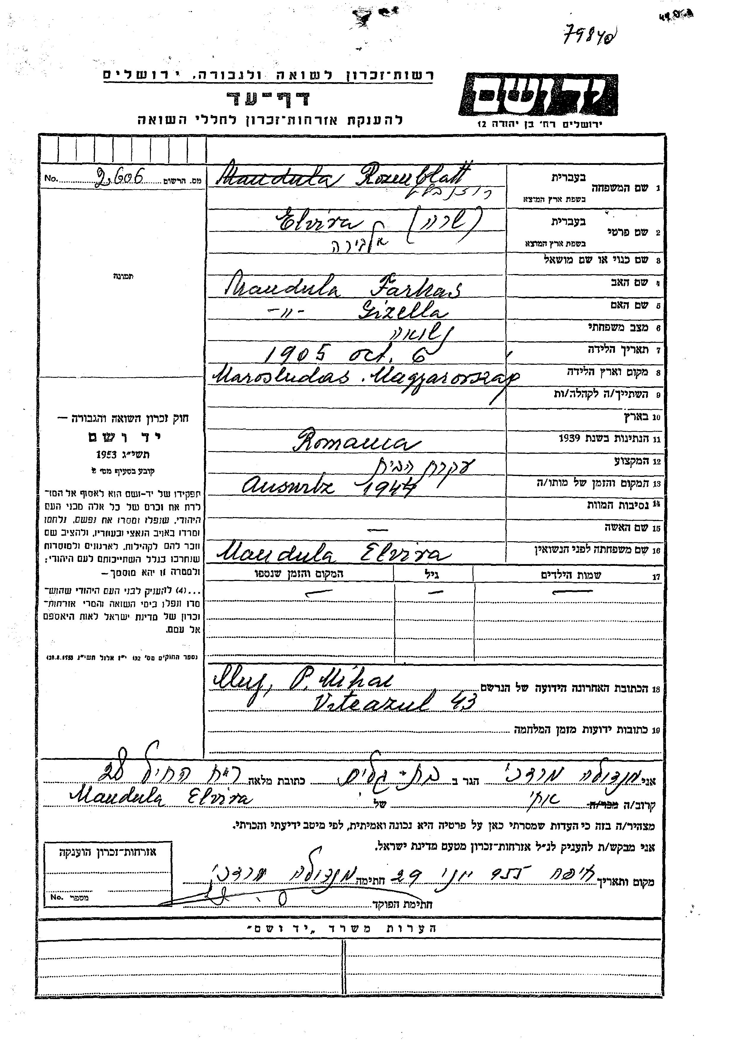 Rozenblatt Elvira Sara 1905 endroit inconnu, Feuille de témoignage