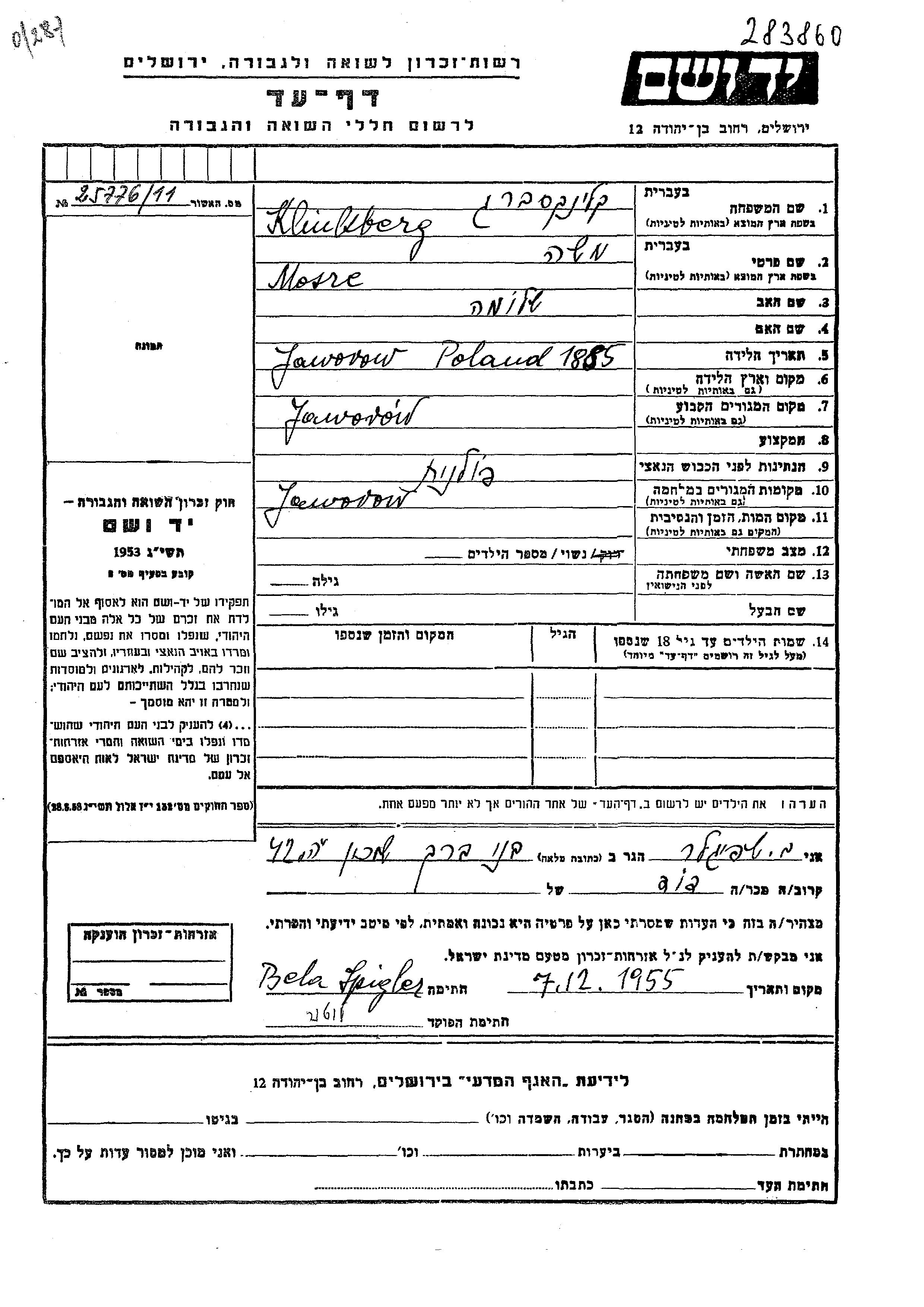 Klinksberg Mosze 1885 endroit inconnu, Feuille de témoignage