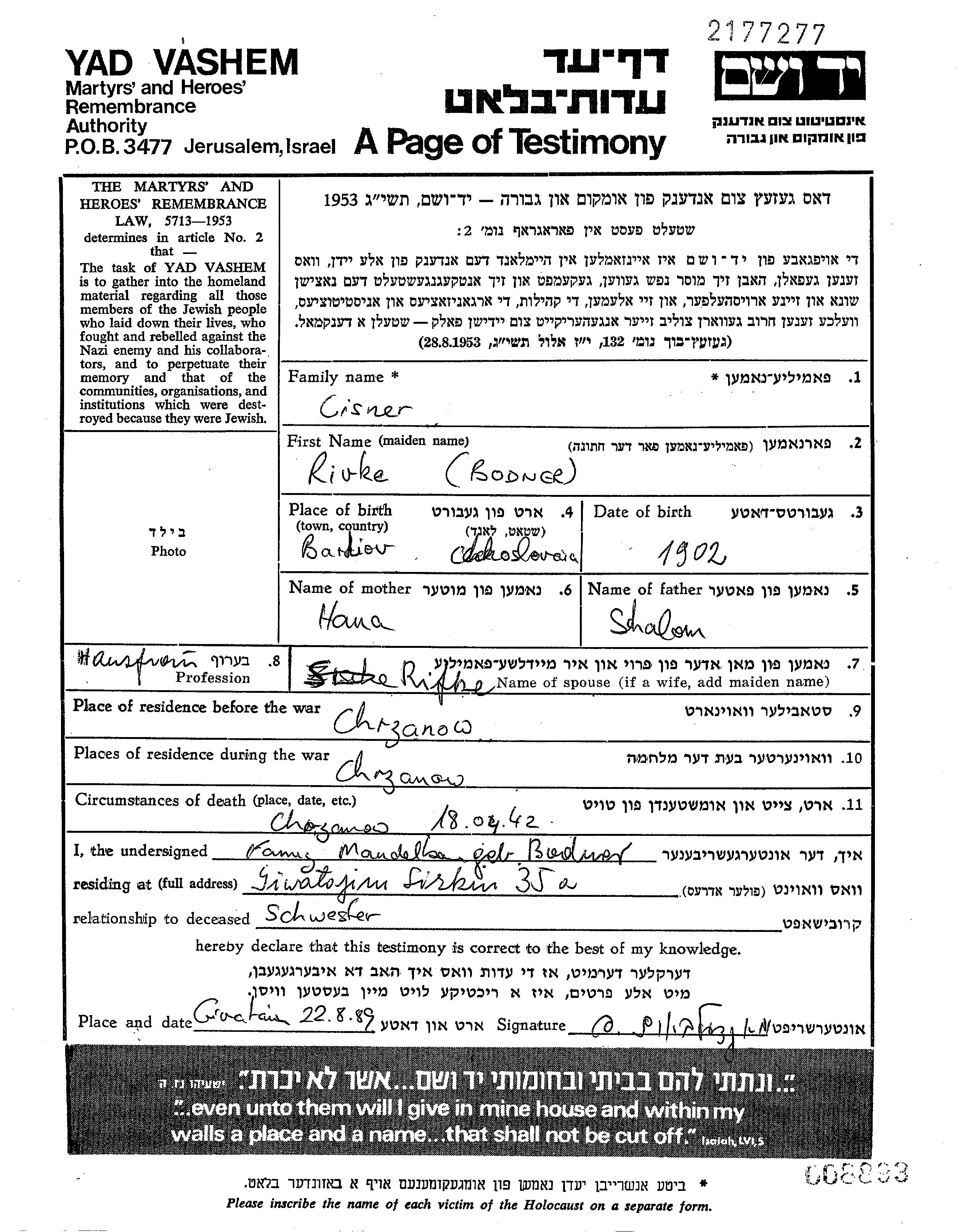 Rivke Cisner née Bodner est née à Bardiov, Tchécoslovaquie en 1902. Elle était Femme au foyer. Avant la seconde guerre mondiale elle vivait à Chrzanow, Pologne.