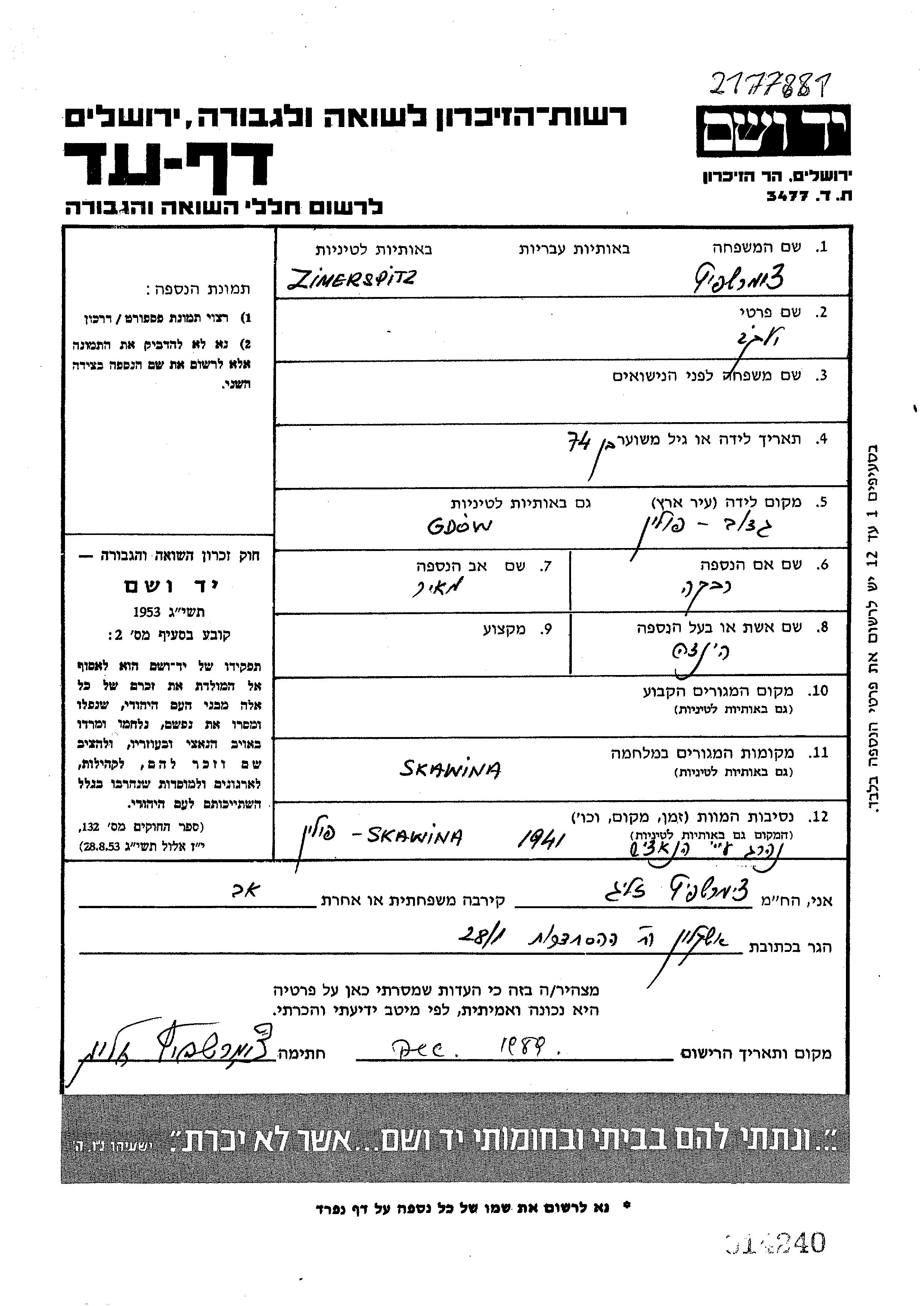 Zimerspitz Yaakov 1867 Skawina, Pologne Feuille de témoignage
