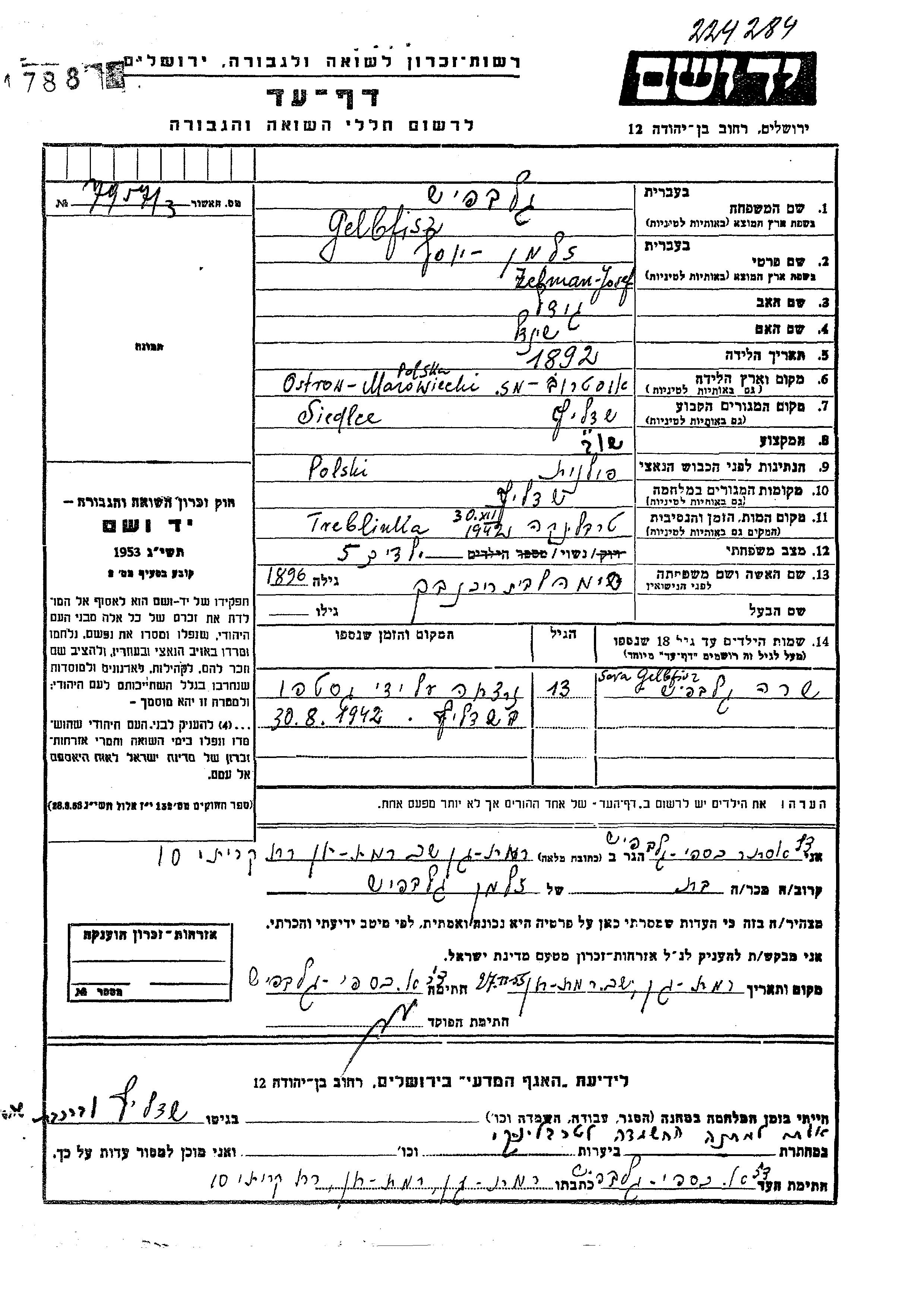 Gelbfisz Zelman Josef 1892 Siedlce, Pologne Feuille de témoignage