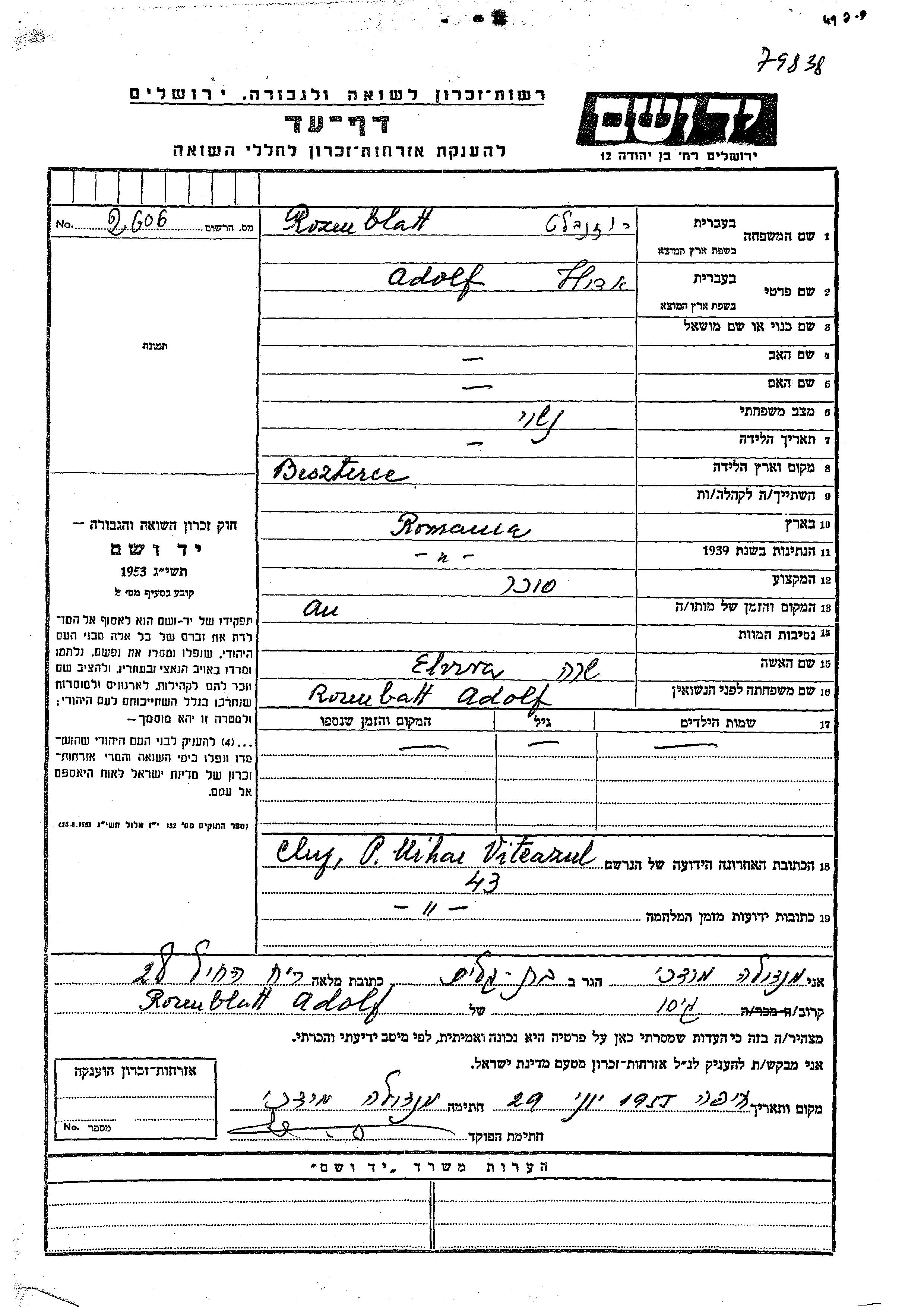 Rozenblatt Adolf Cluj, Roumanie Feuille de témoignage