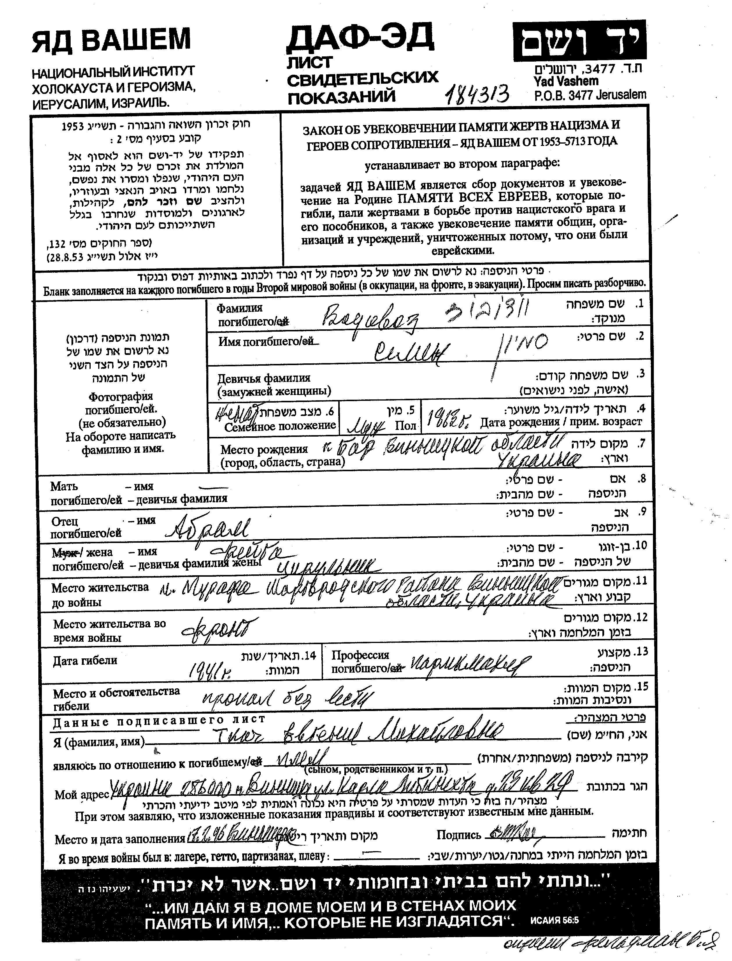 Vodovoz | Semion | 1913 | Murafa, Ukraine (URSS) | Feuille de témoignage |
