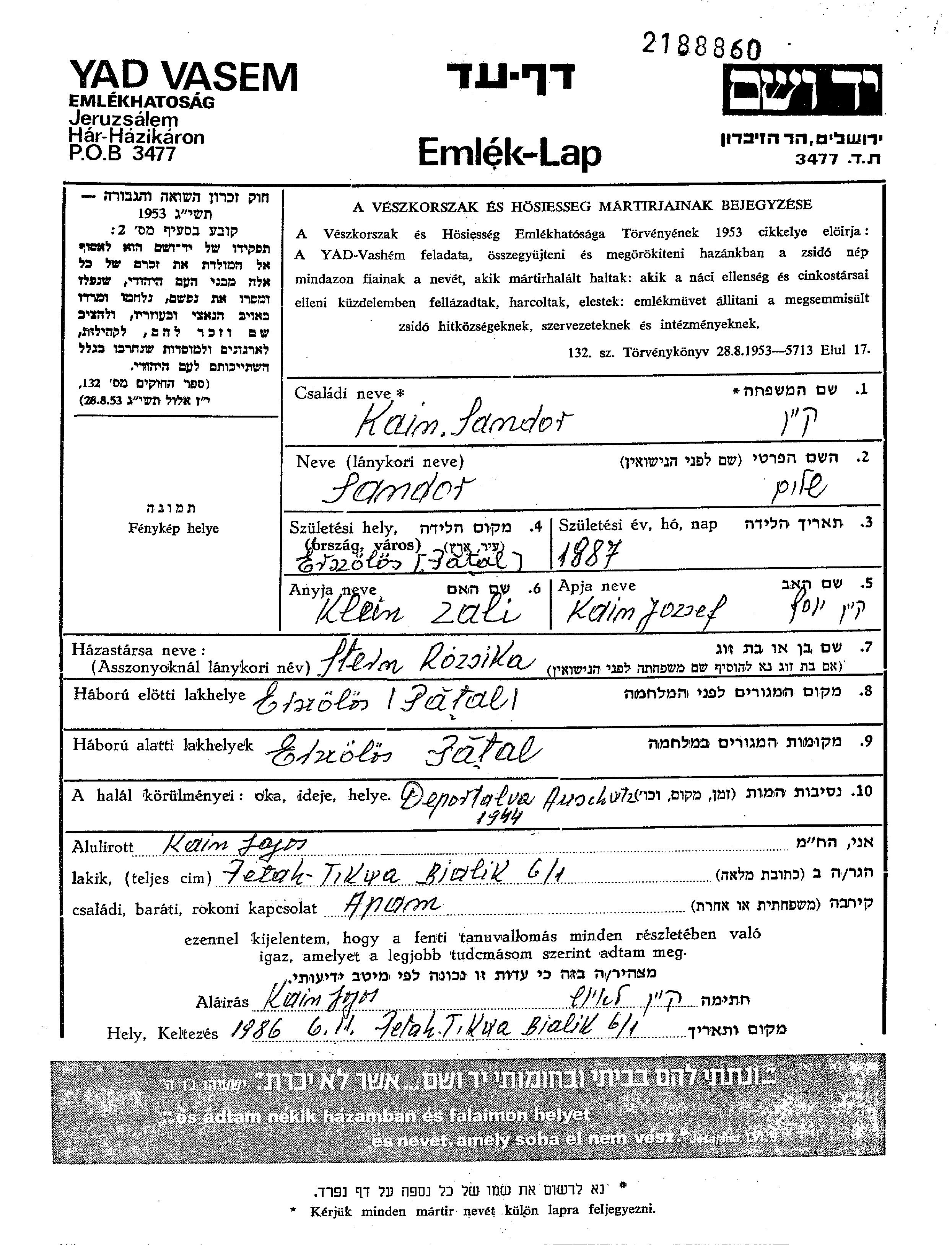Kain Kuin | Sandor Shalom | Tasnad, Roumanie | Feuille de témoignage |