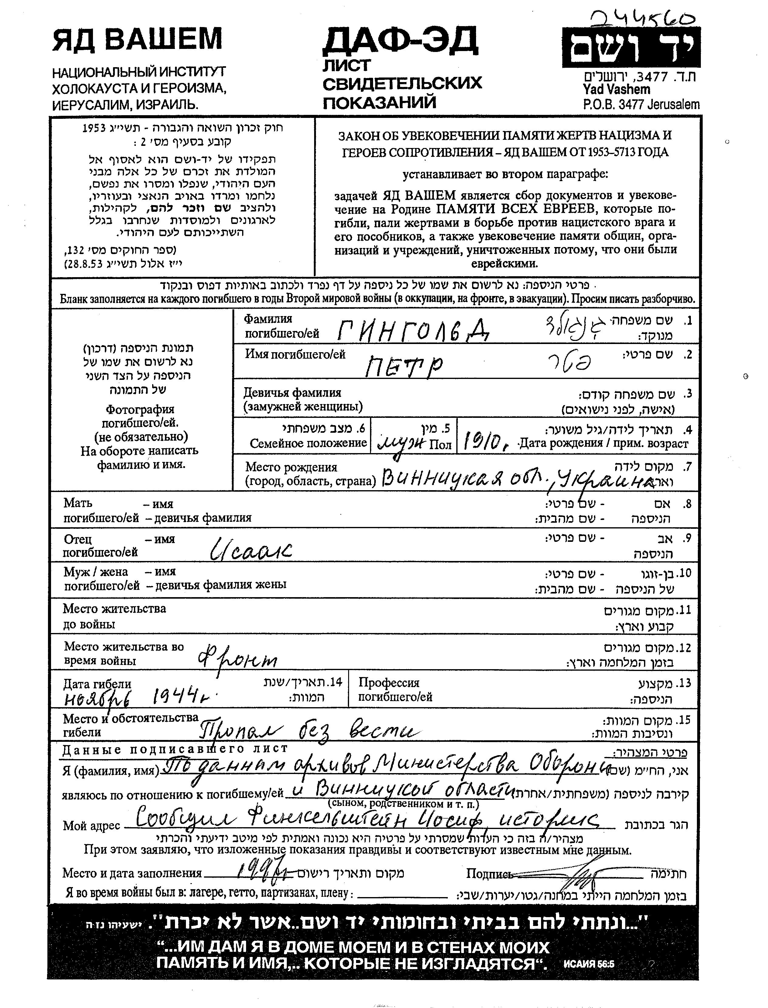 Gingold Pyotr 1910 endroit inconnu, Feuille de témoignage