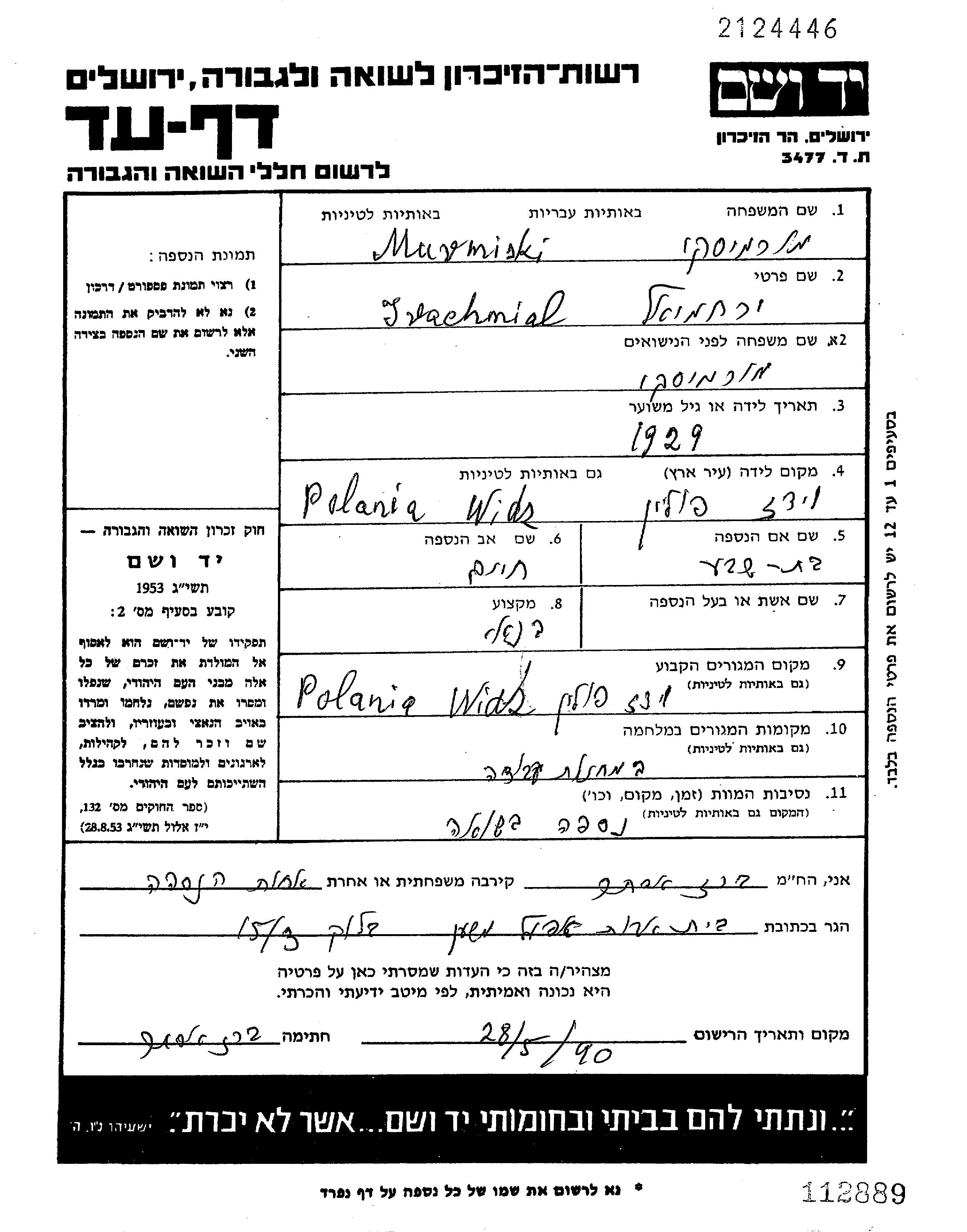Murmiski | Jrachmial | 1929 | Widze, Pologne | Feuille de témoignage |