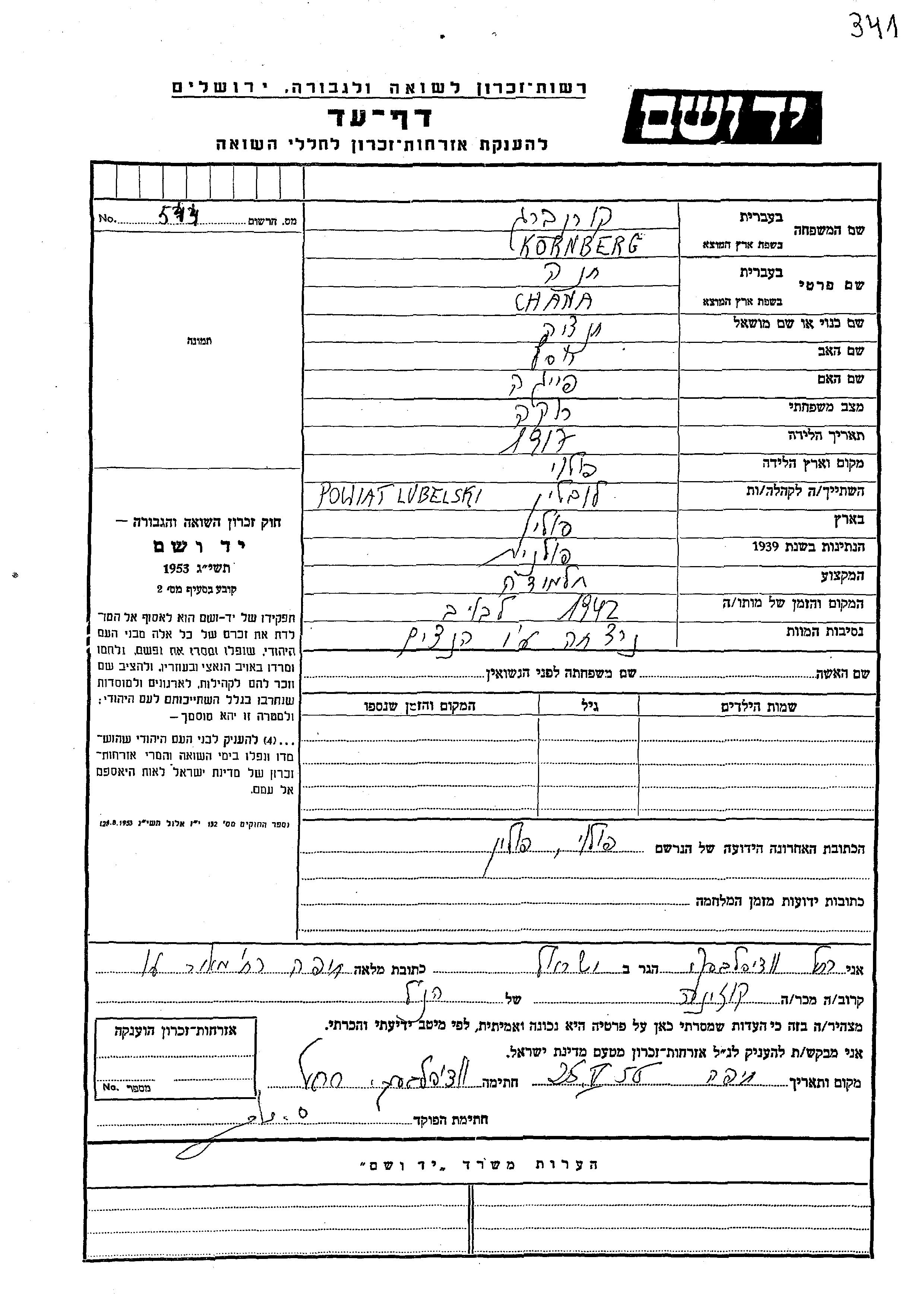 Kornberg Chana 1917 Pologne Feuille de témoignage