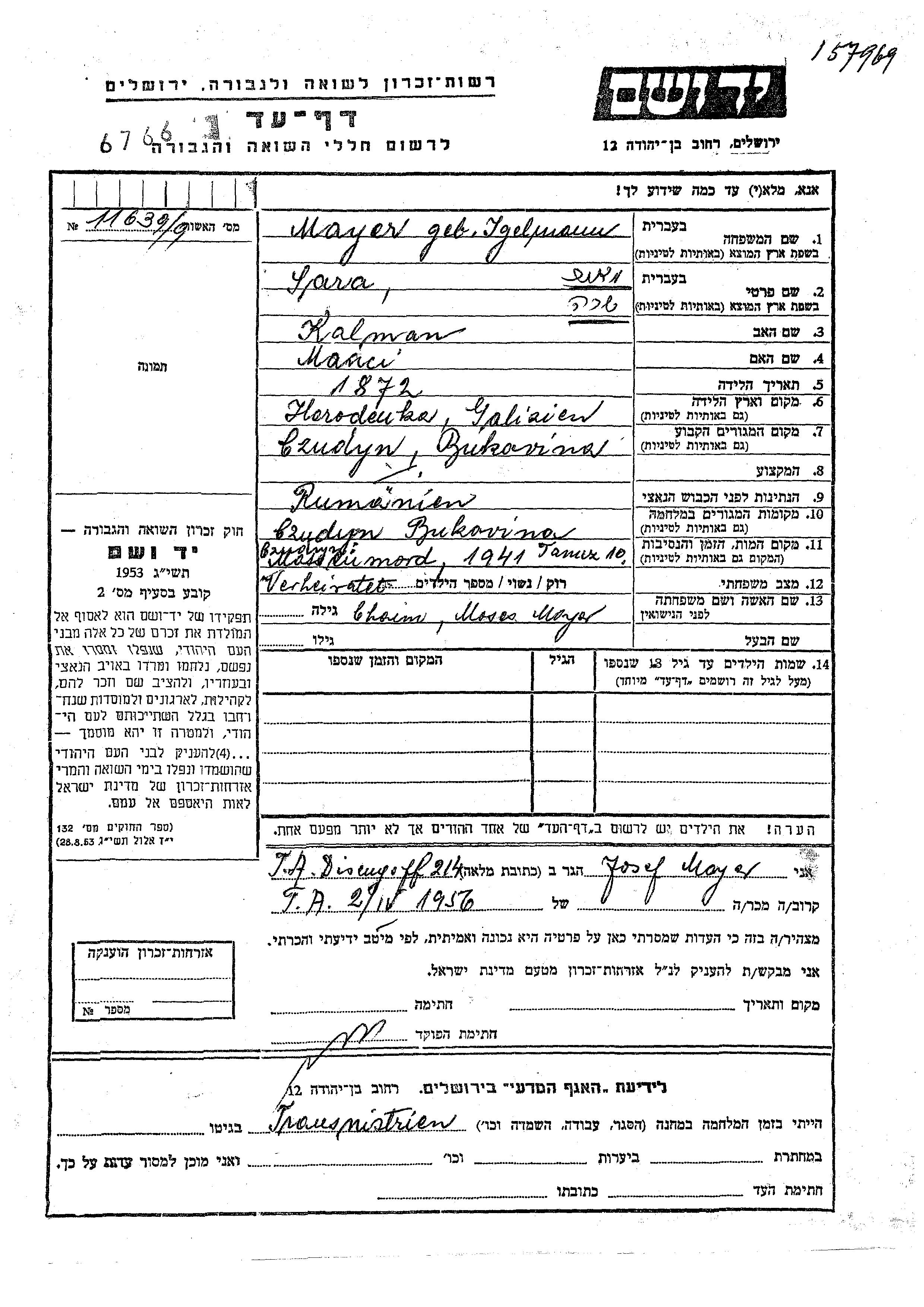 Sara Mayer née Igelman est née à Horodenka, Pologne en 1872, fille de Kalman et de Manci. Elle était Mariée à Chaim Moses. Avant la seconde guerre mondiale elle vivait à Czudyn, Roumanie. Pendant la guerre, elle était à Czudyn, Roumanie.