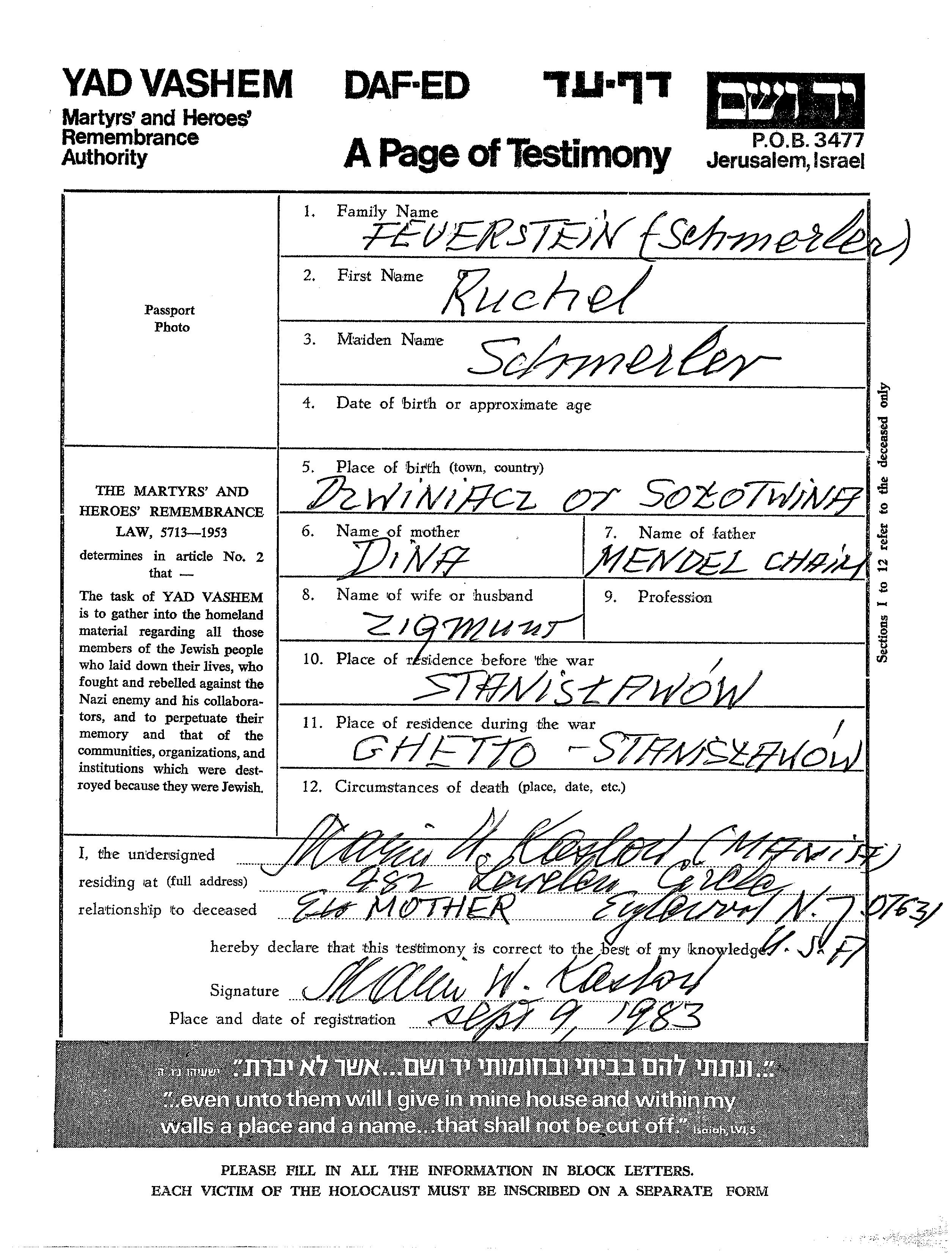 Feuerstein Ruchel Stanislaw, Pologne Feuille de témoignage