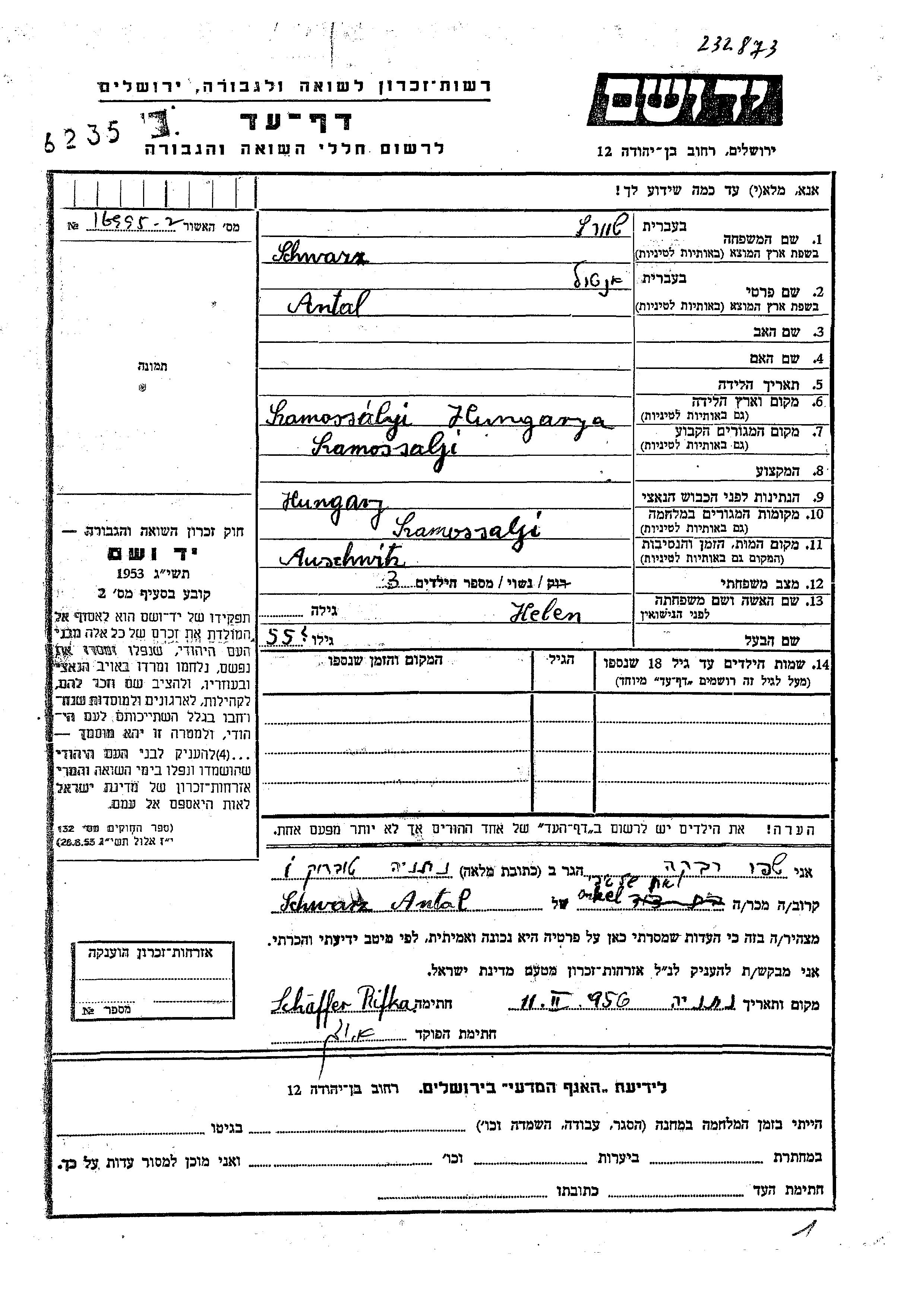 Scwarz Anatol Antal Szamossalyi, Hongrie Feuille de témoignage