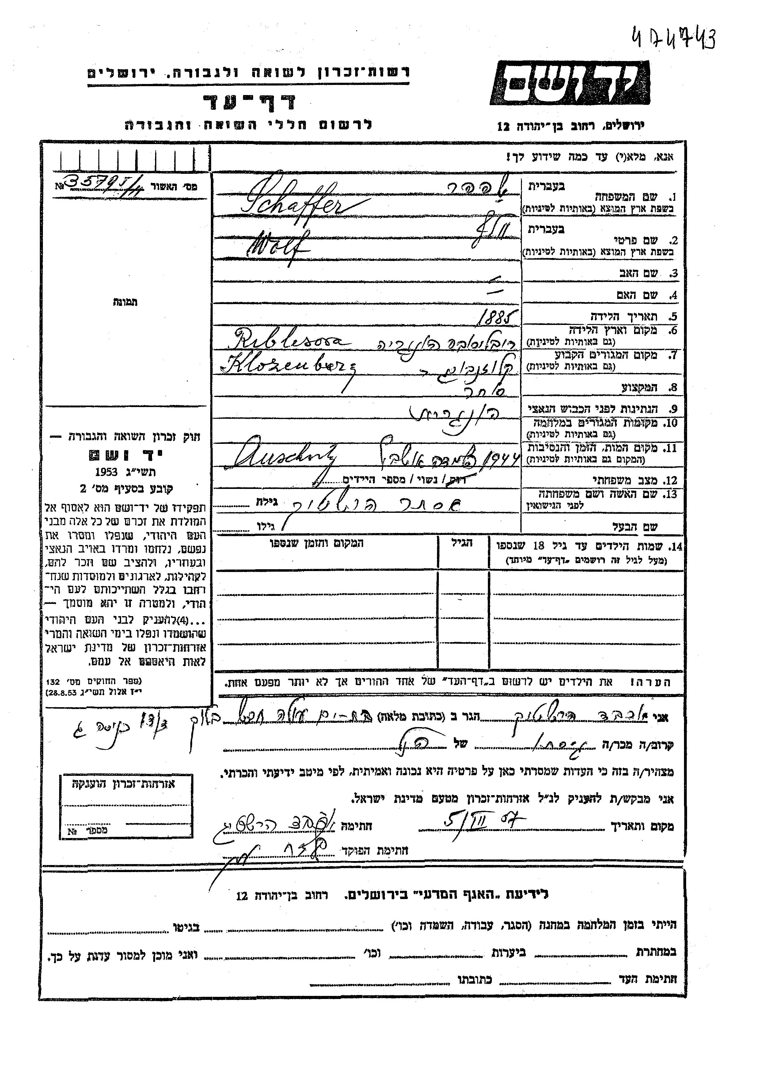 Wolf Schaffer est né à Ribriszora, Roumanie en 1885. Il était Commerçant/e et Mariée à Ester née Hershtik. Avant la seconde guerre mondiale il vivait à Klozenberg, Roumanie.