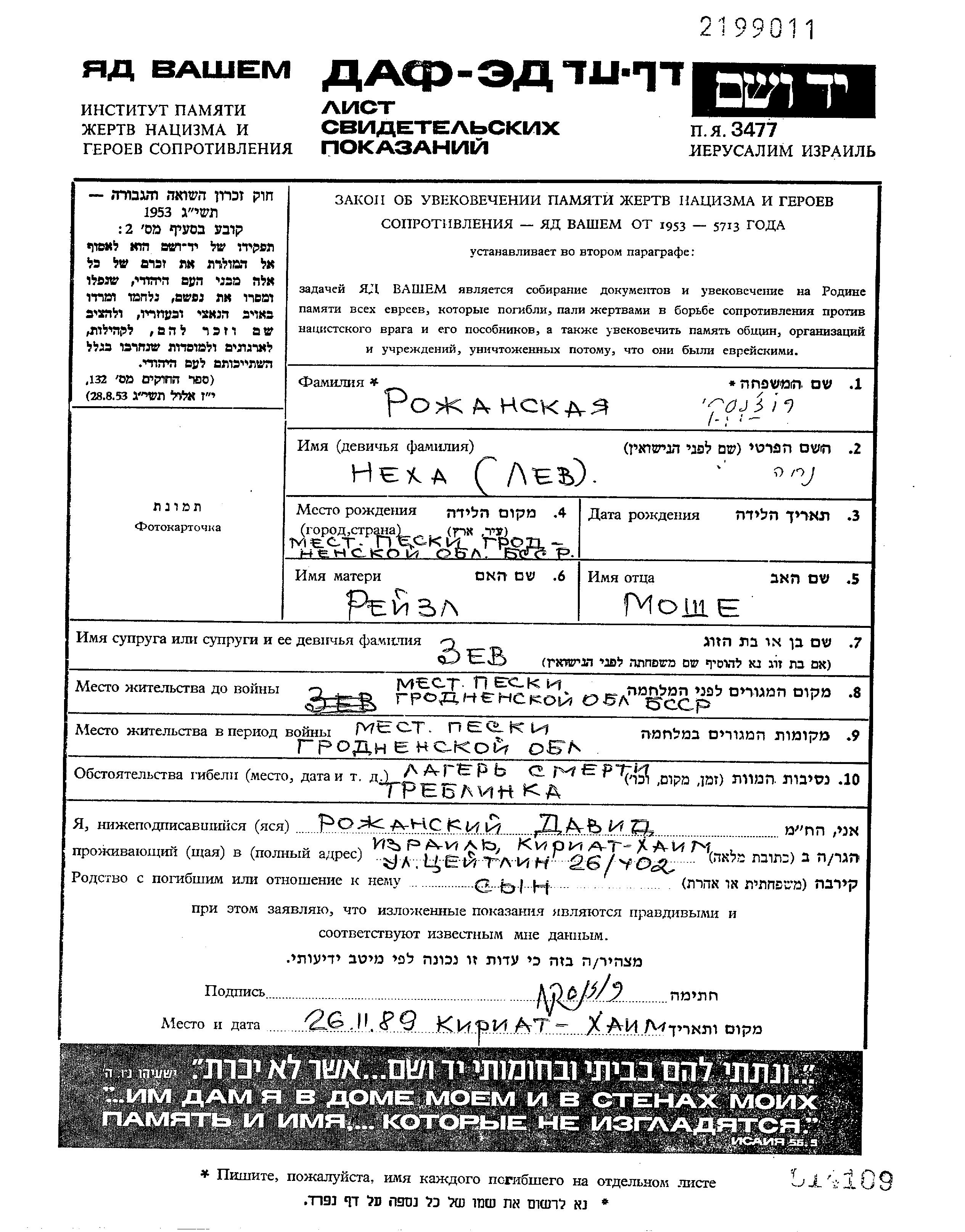 Rozanski Nekhama Piaski, Pologne Feuille de témoignage