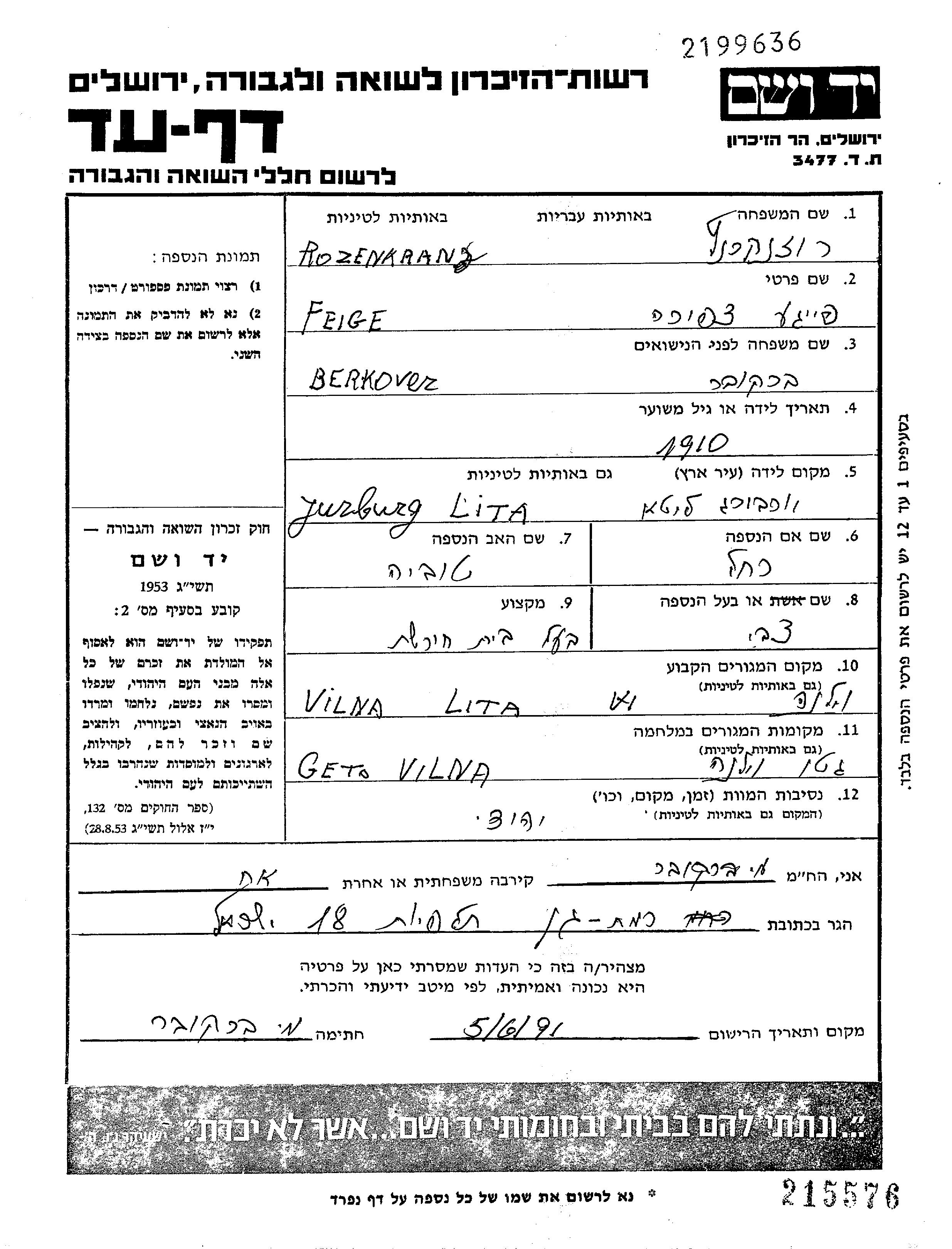 Rozenkranz Feiga Tzipora 1910 Vilnius, Pologne Feuille de témoignage