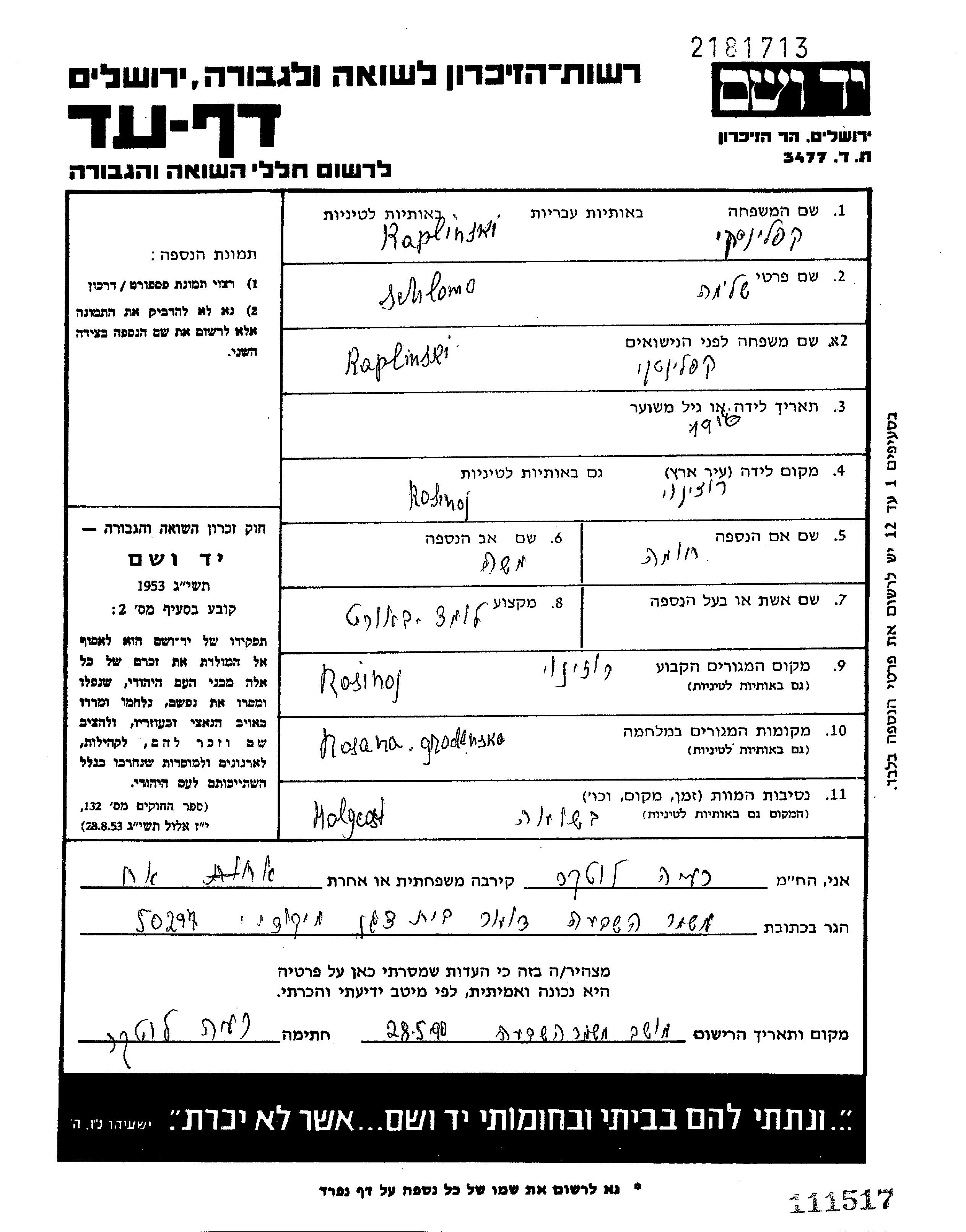 Kaplinski Schlomo 1922 Rozana, Pologne Feuille de témoignage