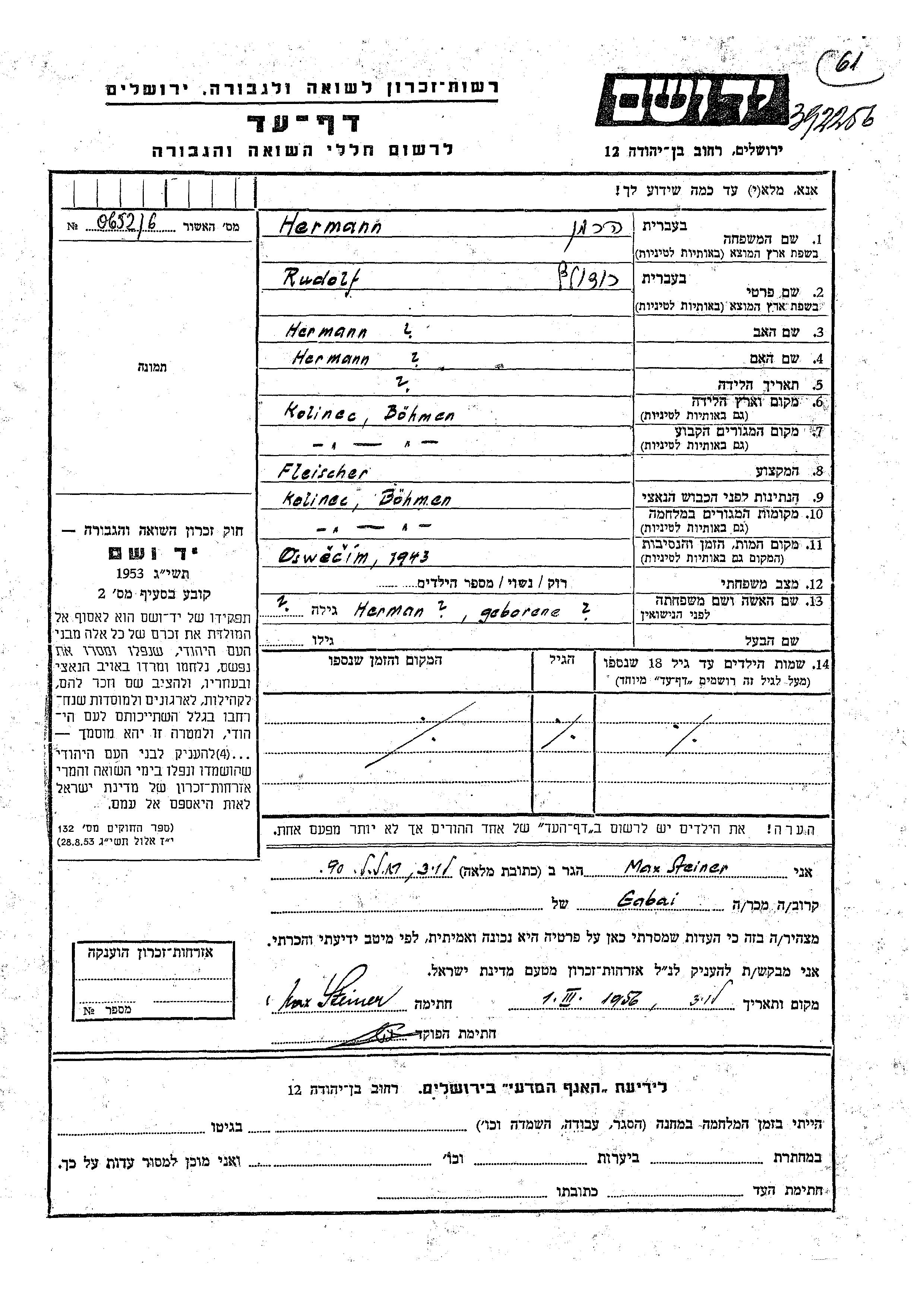 Hermann Rudolf Kolinec, Tchécoslovaquie Feuille de témoignage