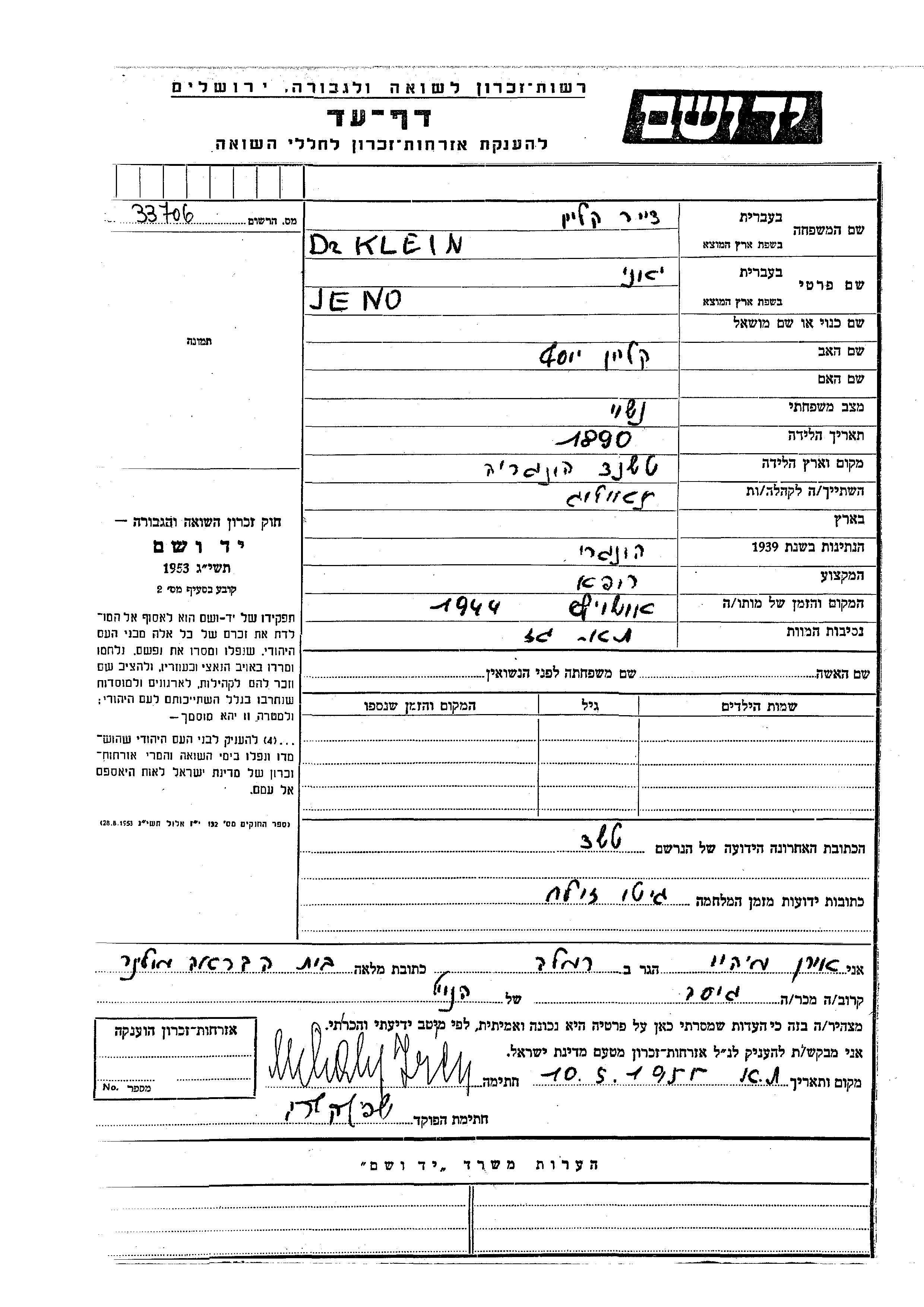 Dr. Jeno Ieni Klein est né à Tasnad, Roumanie en 1890, fils de Yosef. Il était Médecin et Marié. Avant la seconde guerre mondiale il vivait à Tasnad, Roumanie. Au cours de la guerre, il était à Zilah, Roumanie.