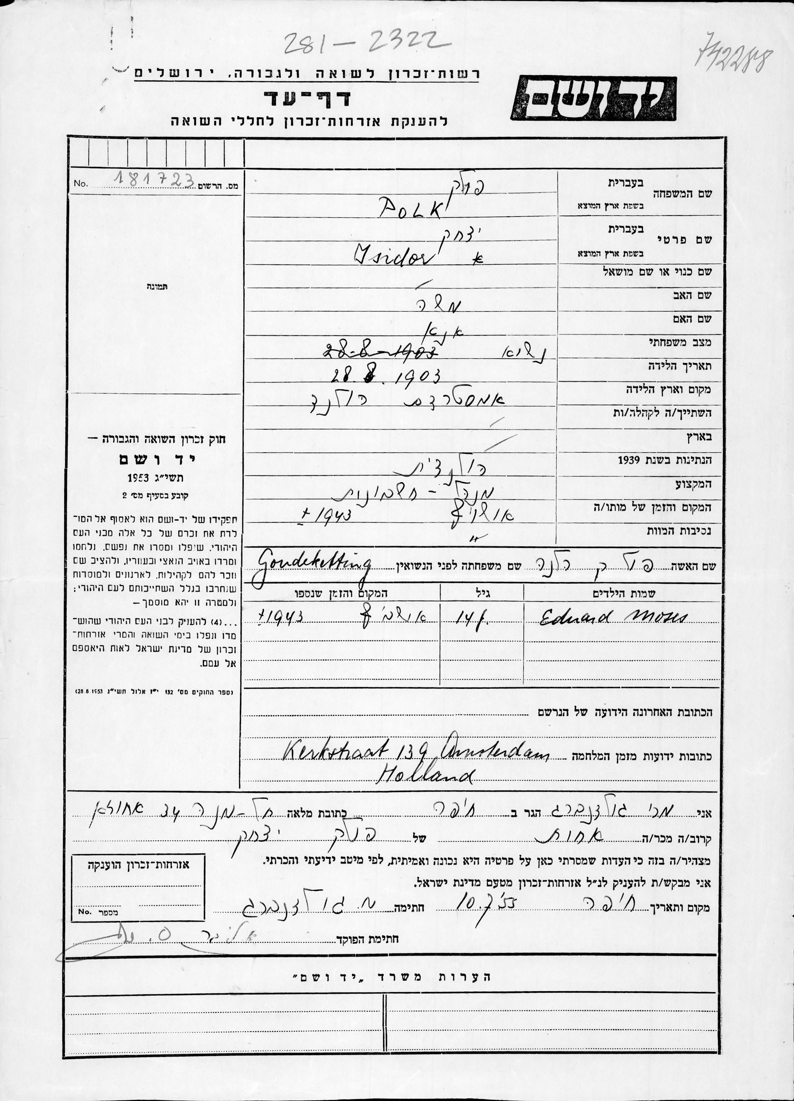 Eduard Moshe Polk est né fils de Isidor Yitzkhak et de Helena née Goudeketting. Il était Enfant. Au cours de la guerre, il était à Amsterdam, Pays-Bas.