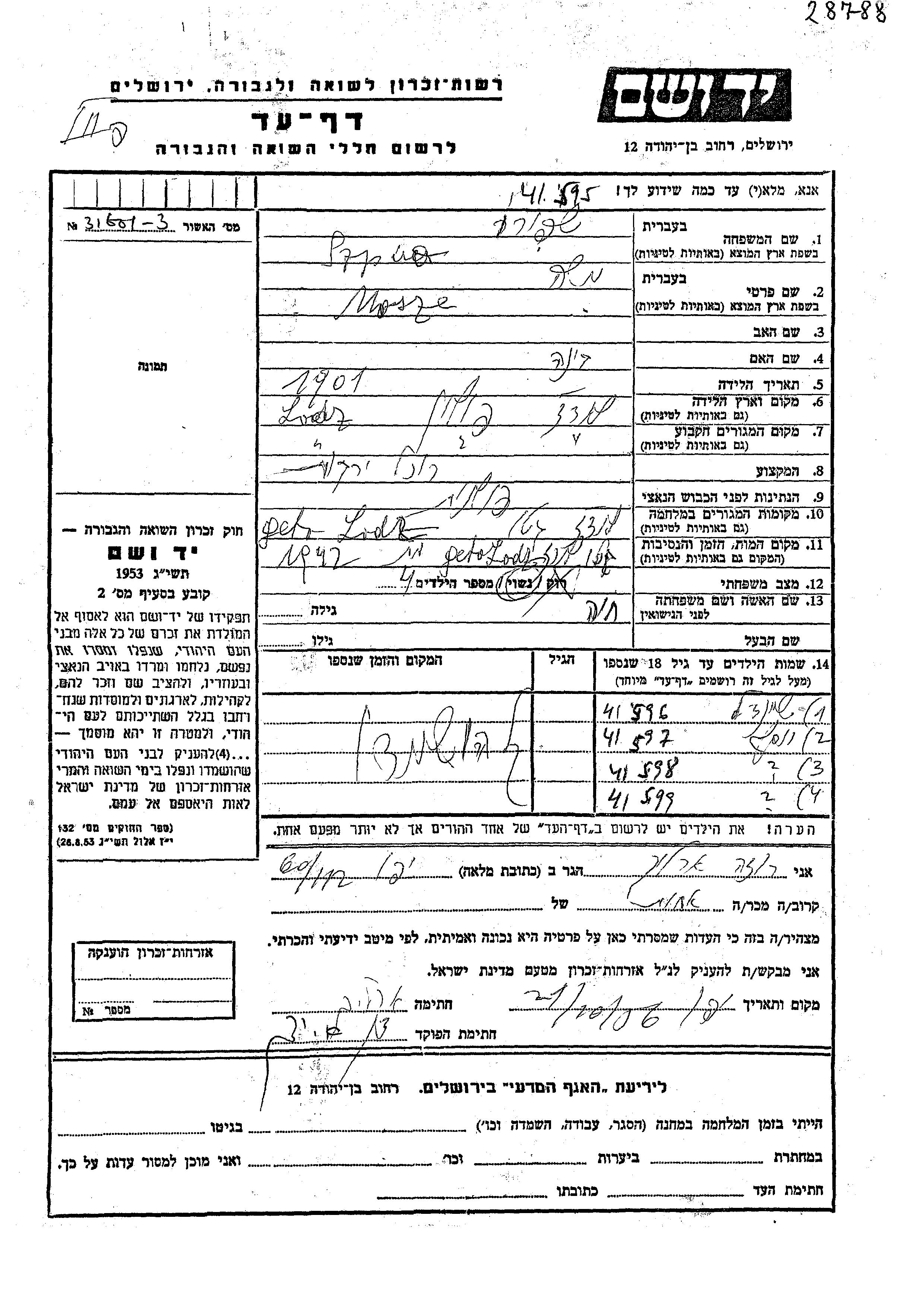 Szpiro Mosze 1901 Lodz, Pologne Feuille de témoignage