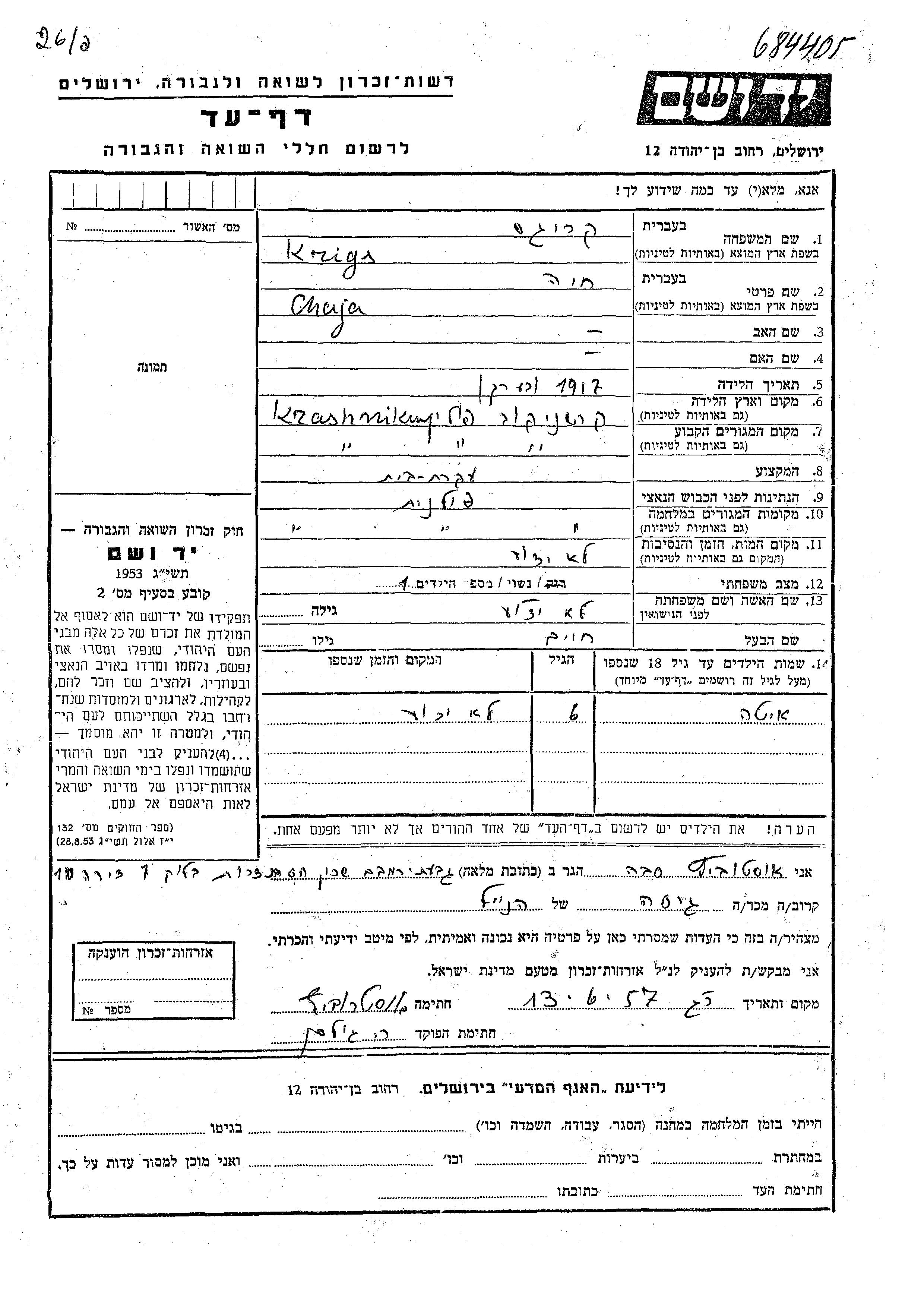 Chaja Krigs est née à Krashnikov, Pologne en 1917. Elle était Femme au foyer et Mariée à Khaim. Avant la seconde guerre mondiale elle vivait à Krashnikov, Pologne. Pendant la guerre, elle était à Krashnikov, Pologne.