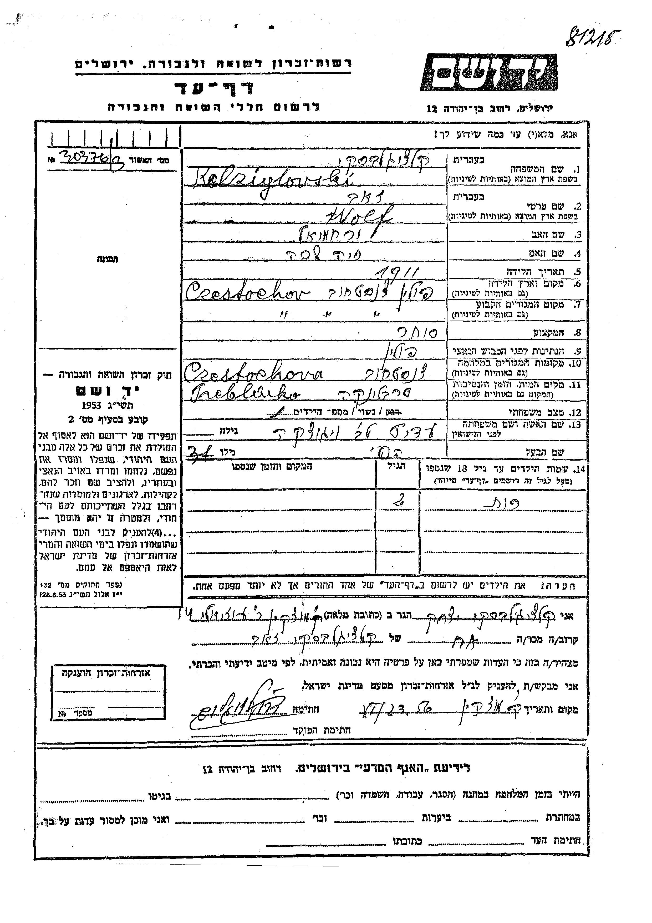 Kelziglovski Wolf Zeev 1911 Czestochow, Pologne Feuille de témoignage