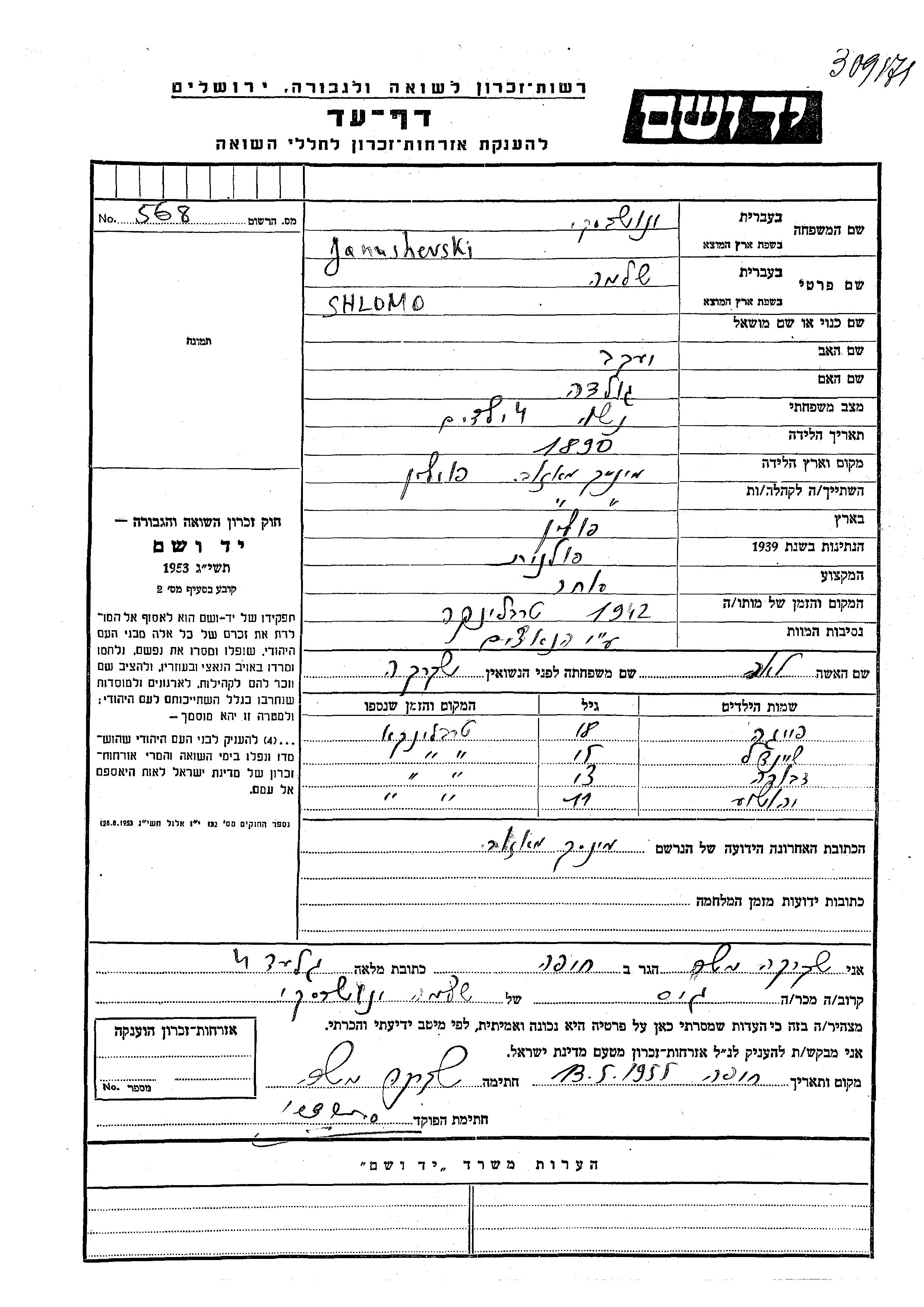 Janushevski Shlomo 1890 Minsk Mazowiecki, Pologne Feuille de témoignage