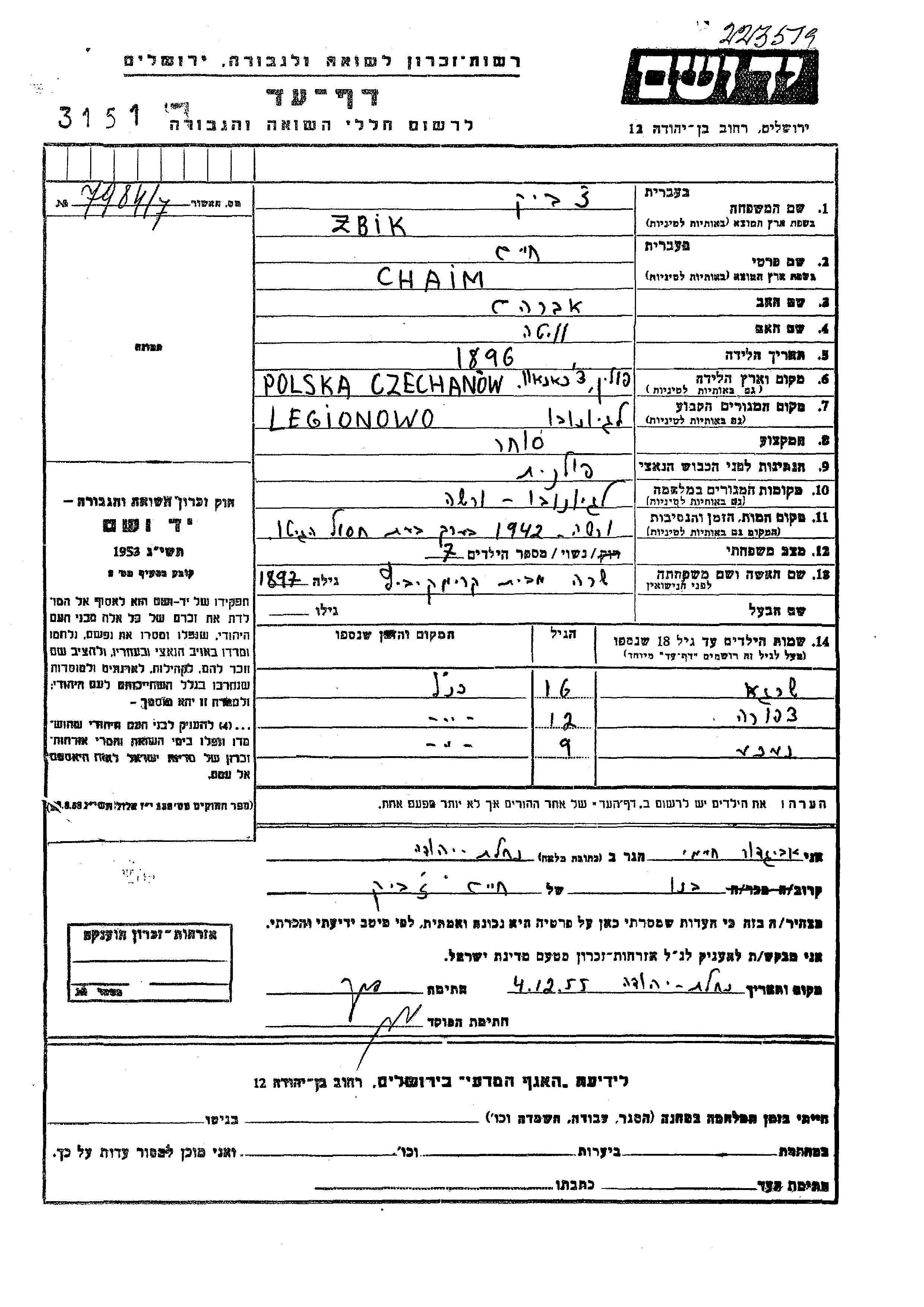 Zbik Chaim 1896 Legionowo, Pologne Feuille de témoignage