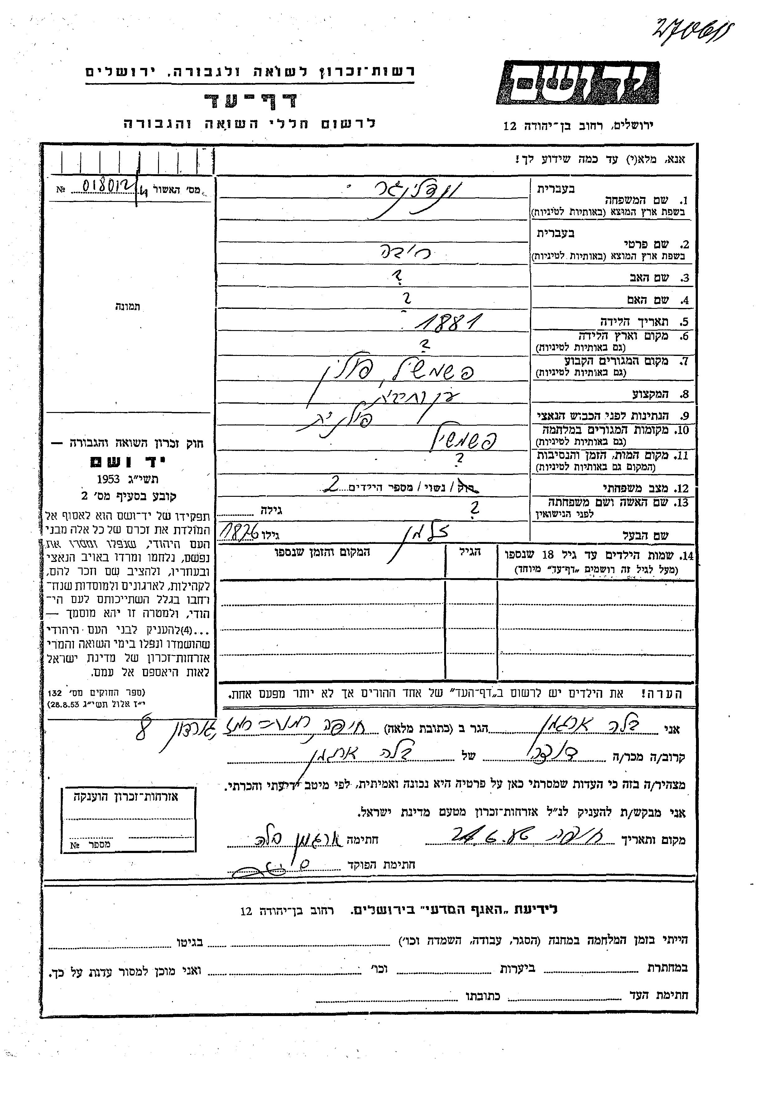 Yad Vashem - Pages of Testimony Names Memorial Collection