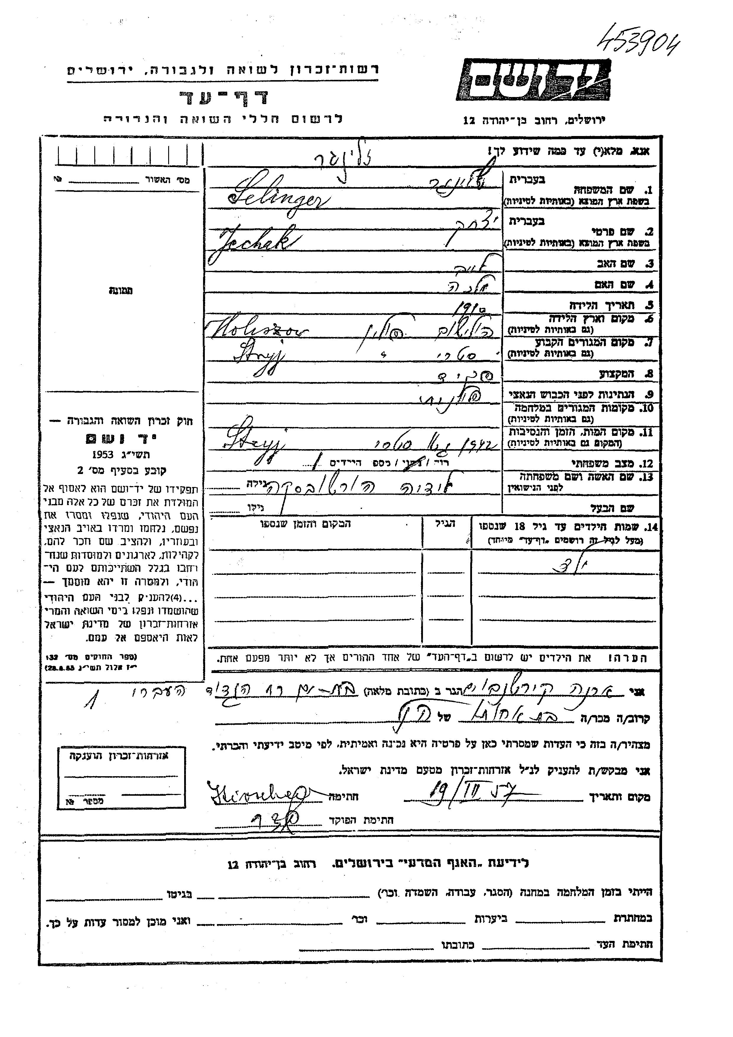 Selinger Shlinger Icchak 1910 Stryj, Pologne Feuille de témoignage
