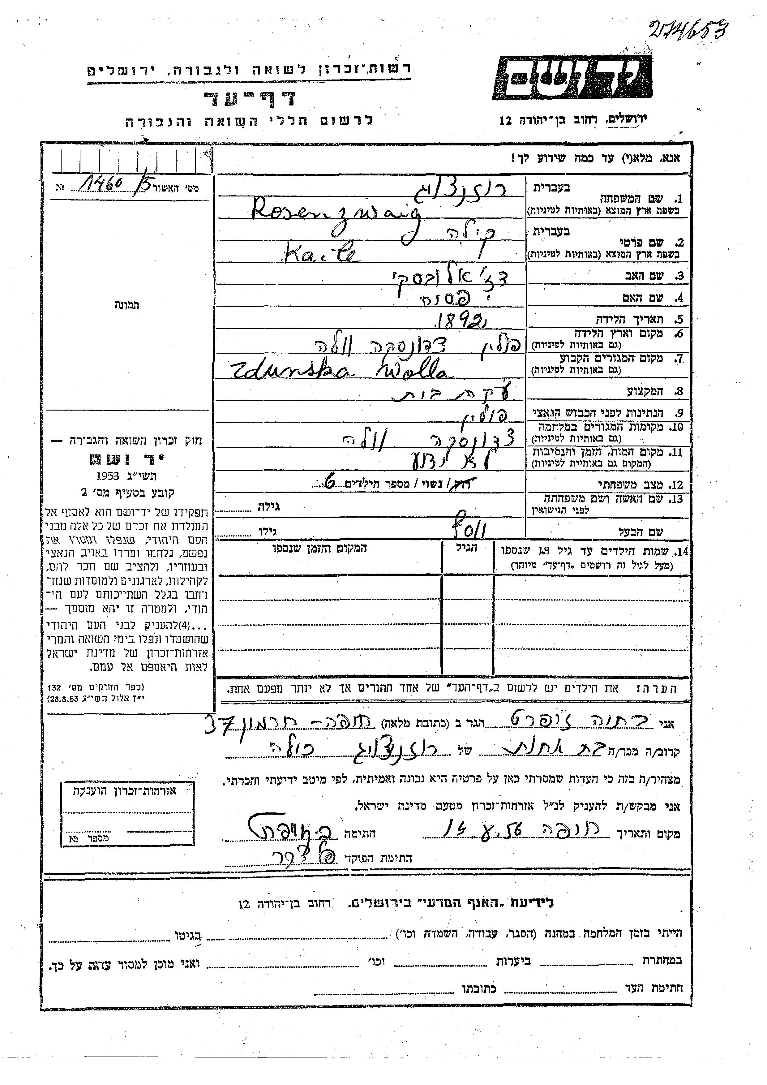 Rosenzwaig Kaila 1892 Zdunska Wola, Pologne Feuille de témoignage